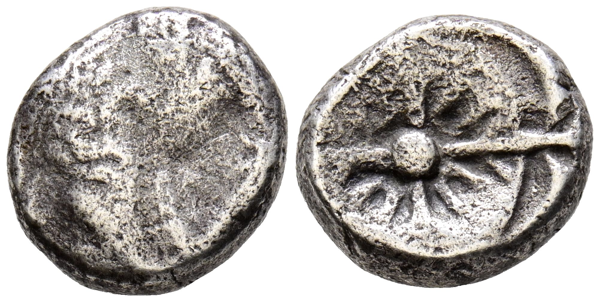 RODETON (Rosas, Gerona). Dracma, imitación Gala. (Ar. 4,72g/14mm). 250-195 a.C. (FAB-2011 var). Anv: Cabeza tipo negroide a izquierda. Rev: Cruz con cuadrante y crecientes con puntos. MBC-.