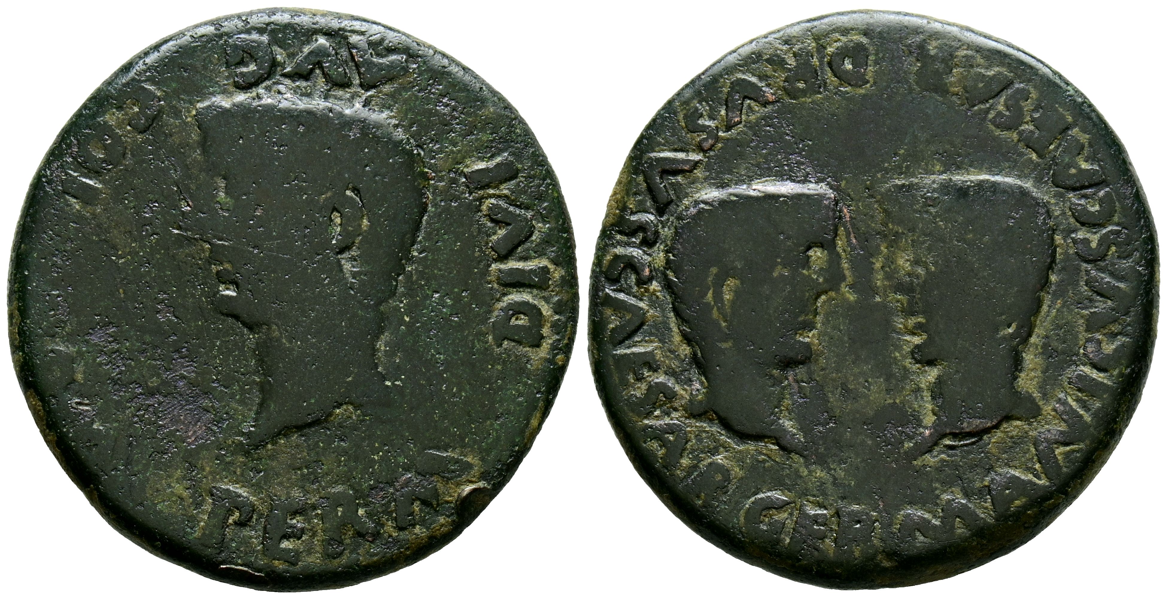 COLONIA ROMULA (Sevilla). As. (Ae. 12,09g/28mm). 27 a.C.-14 d.C. (FAB-2016). Anv: Cabeza laureada de Tiberio a izquierda, alrededor leyenda: PERM DIVI AVG COL ROM. Rev: Cabezas de Germánico y Druso enfrentadas, alrededor leyenda: CAESAR GERMANICVS CAESAR DRVSVS. MBC-.