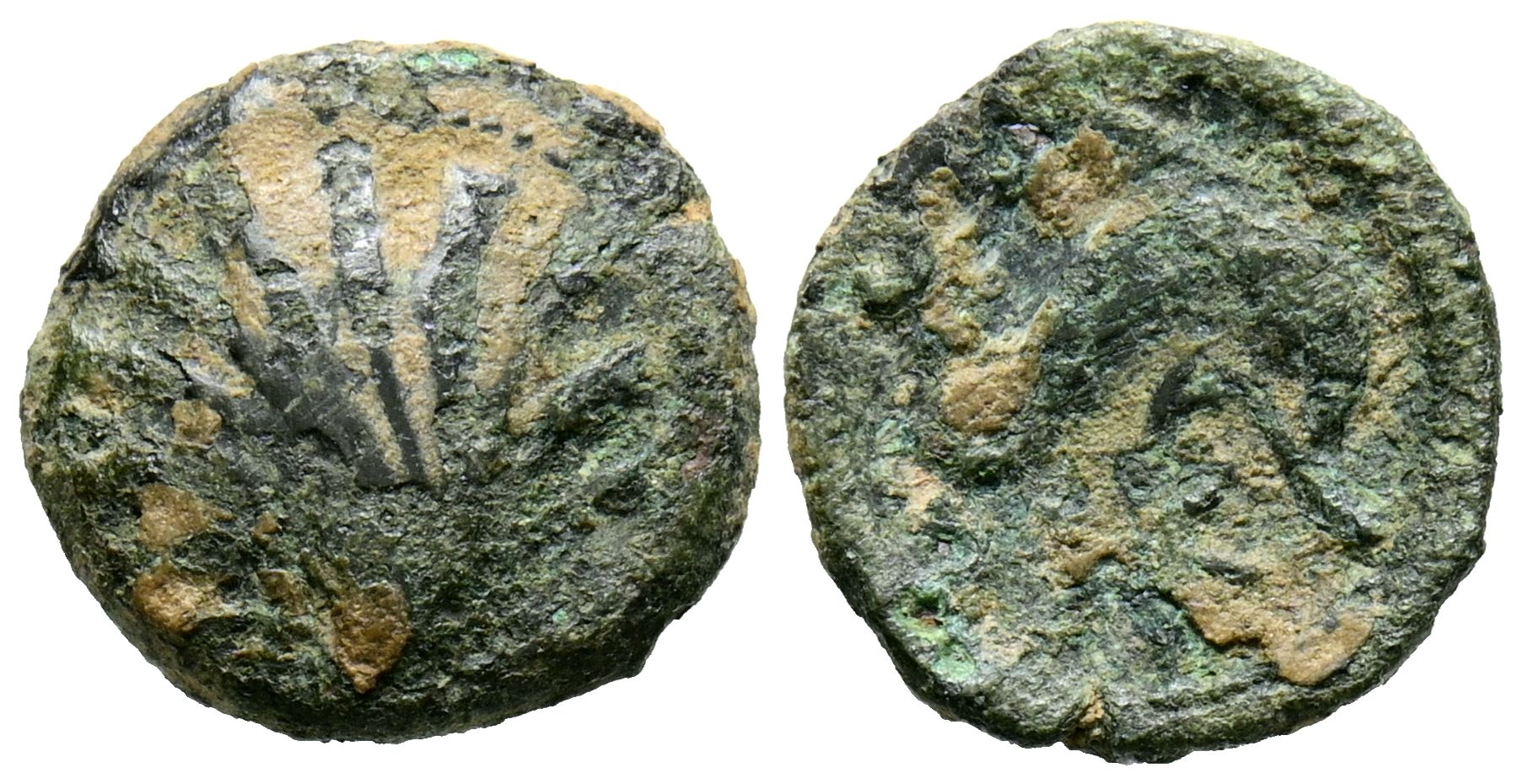 ARSE-SAGUNTO (Sagunto, Valencia). Sextante. (Ae. 1,25g/13mm). 170-20 a.C. (FAB-2064). Anv: Concha. Rev: Delfín a derecha, encima creciente, debajo letra ibérica A y estrella. MBC-.