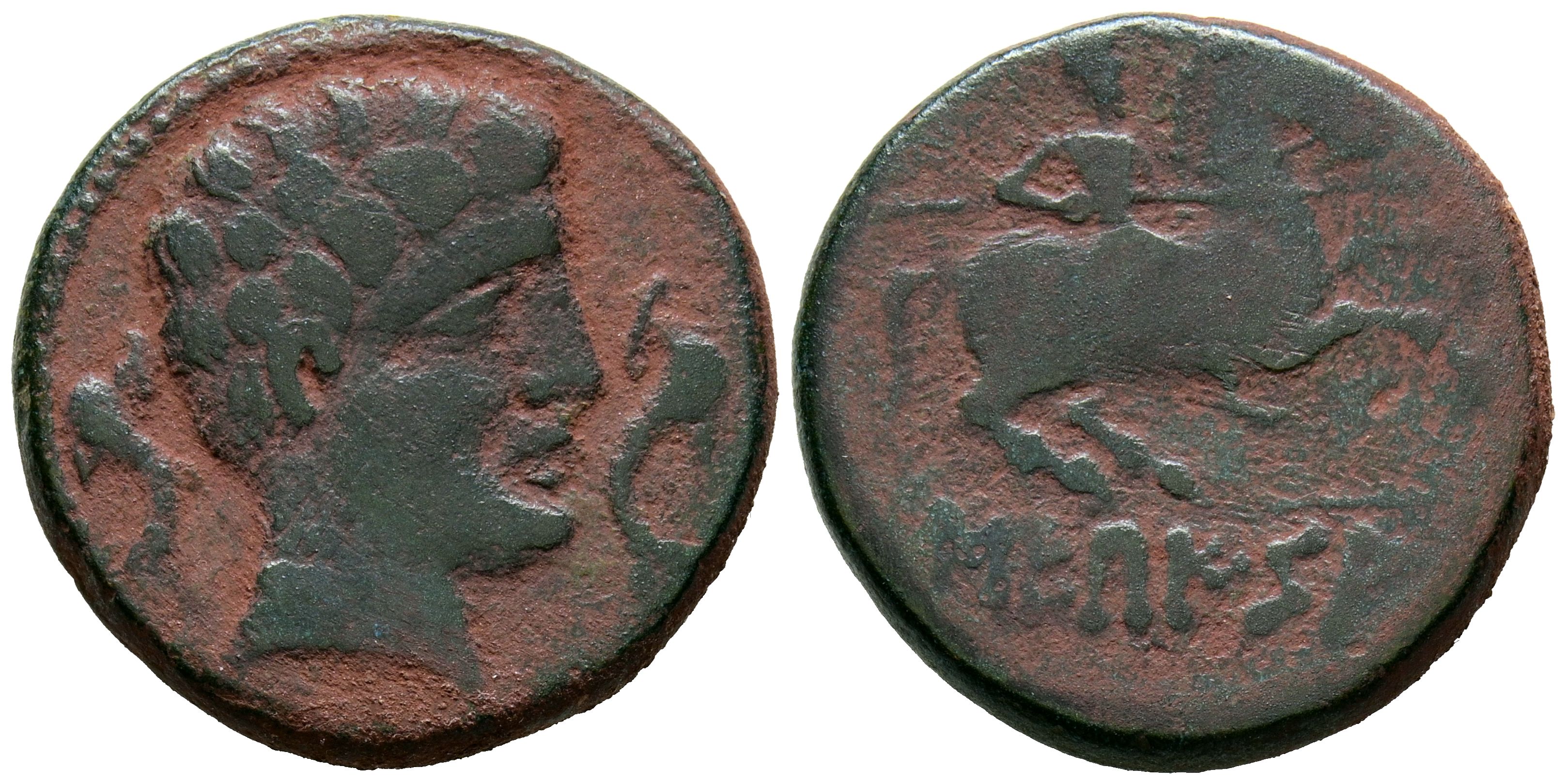 SECAISA (Segeda, Zaragoza). As. (Ae. 8,99g/22mm). 120-20 a.C. (FAB-2131). Anv: Cabeza masculina a derecha, entre dos delfines. Rev: Jinete con lanza a derecha, debajo leyenda ibérica: SECaISA. MBC-.