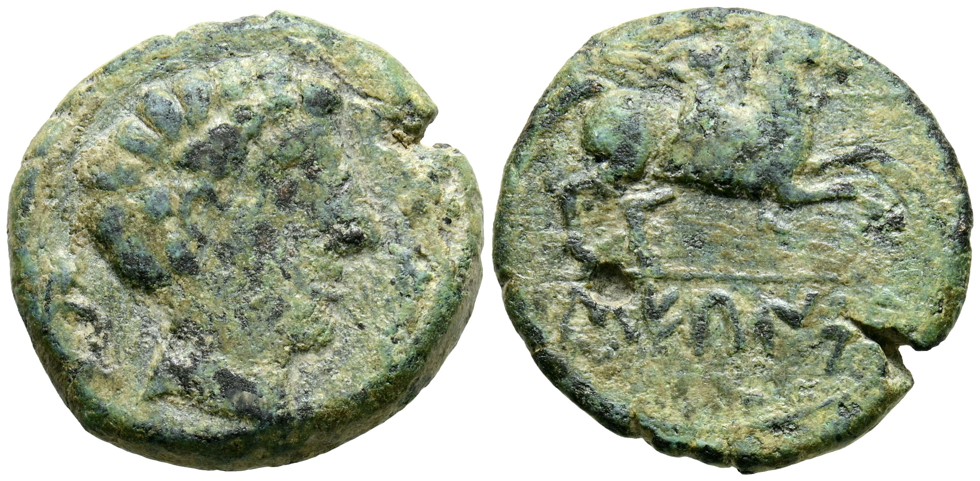 SECAISA (Segeda, Zaragoza). As. (Ae. 8,59g/24mm). 120-20 a.C. (FAB-2131). Anv: Cabeza masculina a derecha entre delfines. Rev: Jinete con lanza a derecha, debajo leyenda bajo linea: SECaISA. MBC-.