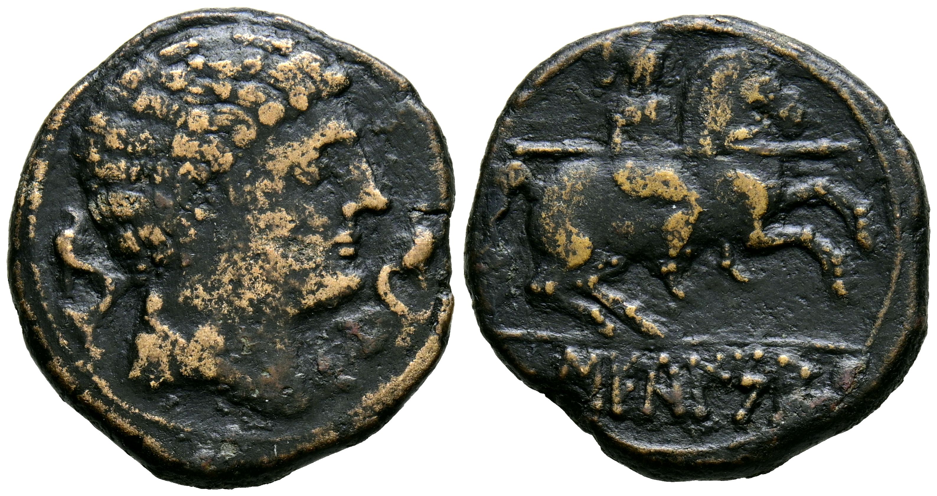 SECAISA (Segeda, Zaragoza). As. (Ae. 6,76g/23mm). 120-20 a.C. (FAB-2131). Anv: Cabeza masculina a derecha entre delfines. Rev: Jinete con lanza a derecha, debajo leyenda bajo línea: SECaISA. MBC-.