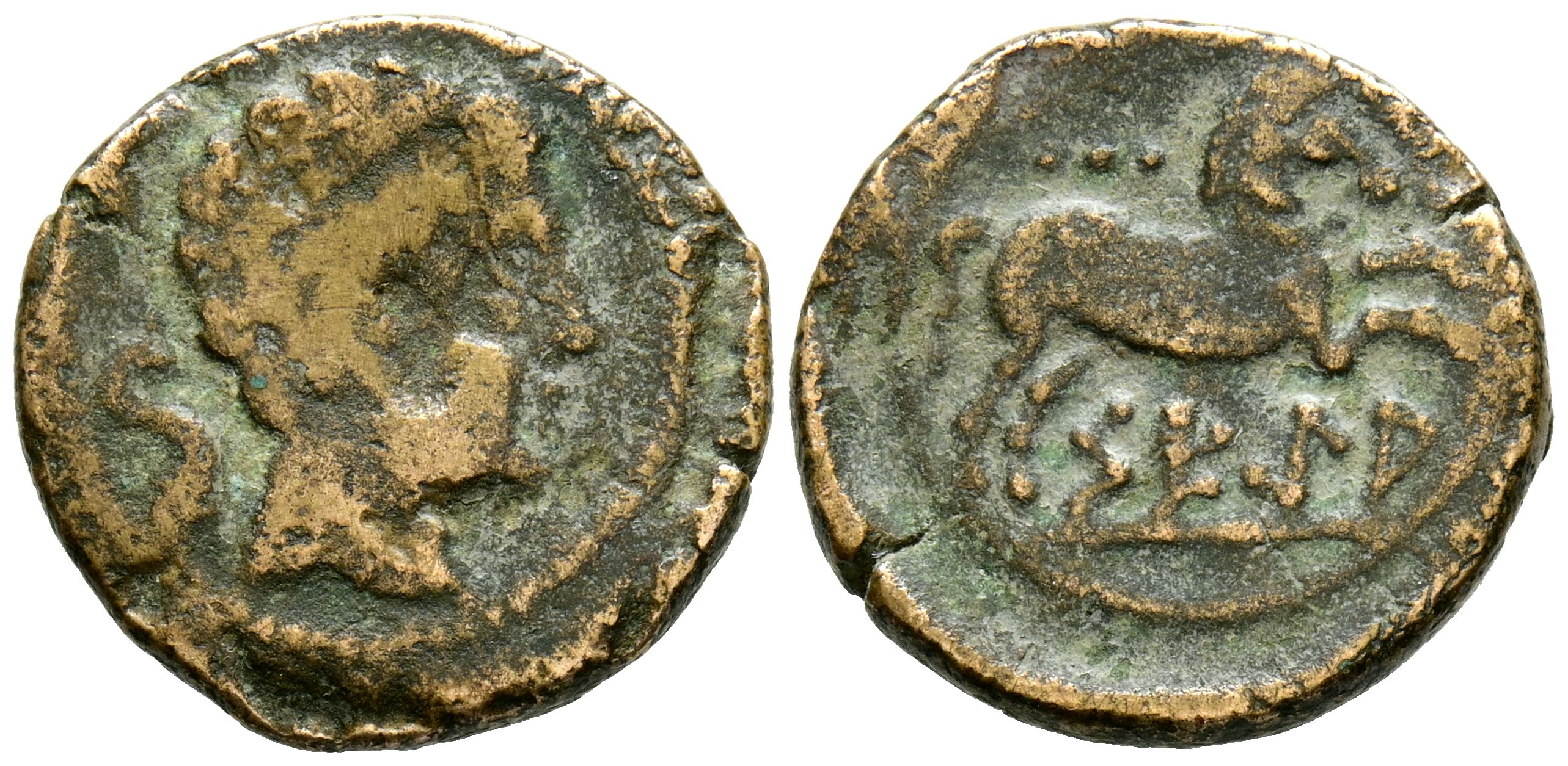 SEGIA (Ejea de los Caballeros, Zaragoza). Cuadrante. (Ae. 3,61g/17mm). 120-20 a.C. (FAB-2166). Anv: Cabeza barbuda a la derecha, detrás de las letras íberas: ON. Rev: Jinete con lanza a la derecha, debajo leyenda ibérica: SEGiA. MBC-. Acuñación descuidada. Limpiada.