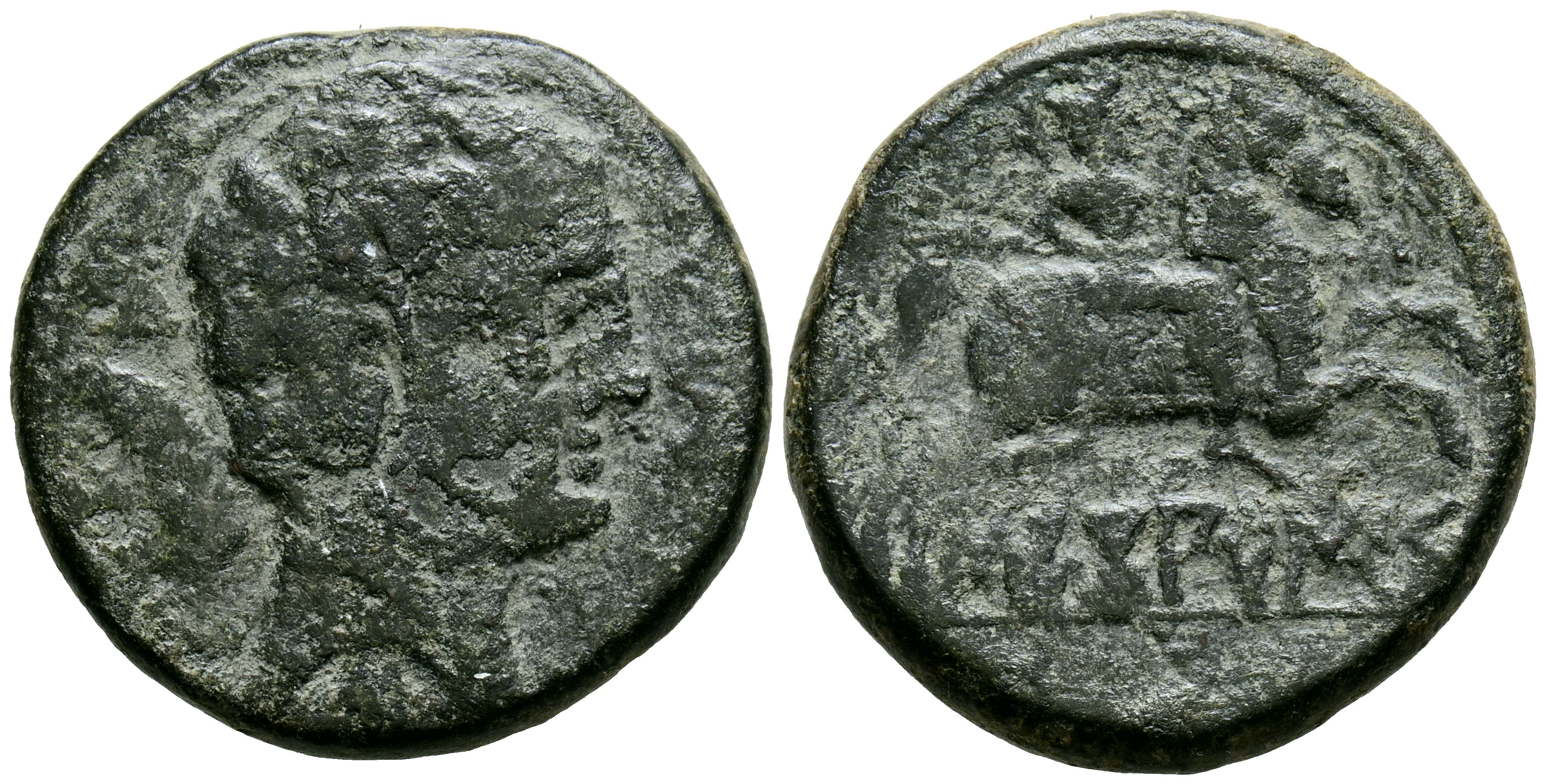 SECOBIRICES (Saelices, Cuenca). As. (Ae. 10,52g/26mm). 30-20 a.C. (FAB-2176). Anv: Cabeza del macho a la derecha, detrás de la palma, delante delfín y debajo letra ibérica S. Rev: Jinete con lanza a la derecha, bajo leyenda iberica: SECoBiRICES. MBC-.
