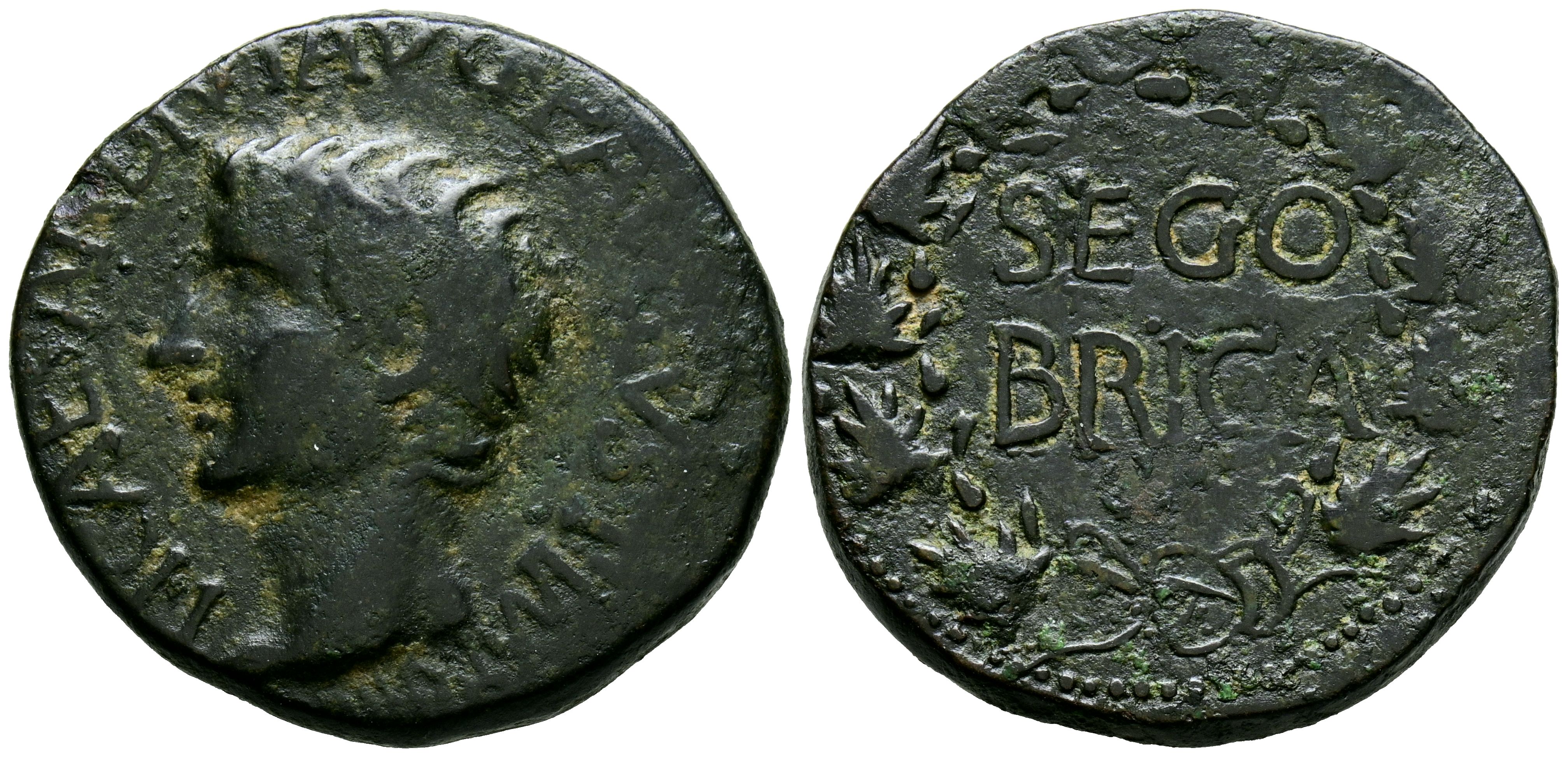 SEGOBRIGA (Saelices, Cuenca). As. (Ae. 13,10g/29mm). 14-36 d.C. (FAB-2188). Anv: Cabeza de Tiberio a izquierda, alrededor leyenda: TI CAESAR DIVI AVG F AVGVS F IMP VIII. Rev: Leyenda: SEGO/BRIGA, dentro de láurea. MBC.