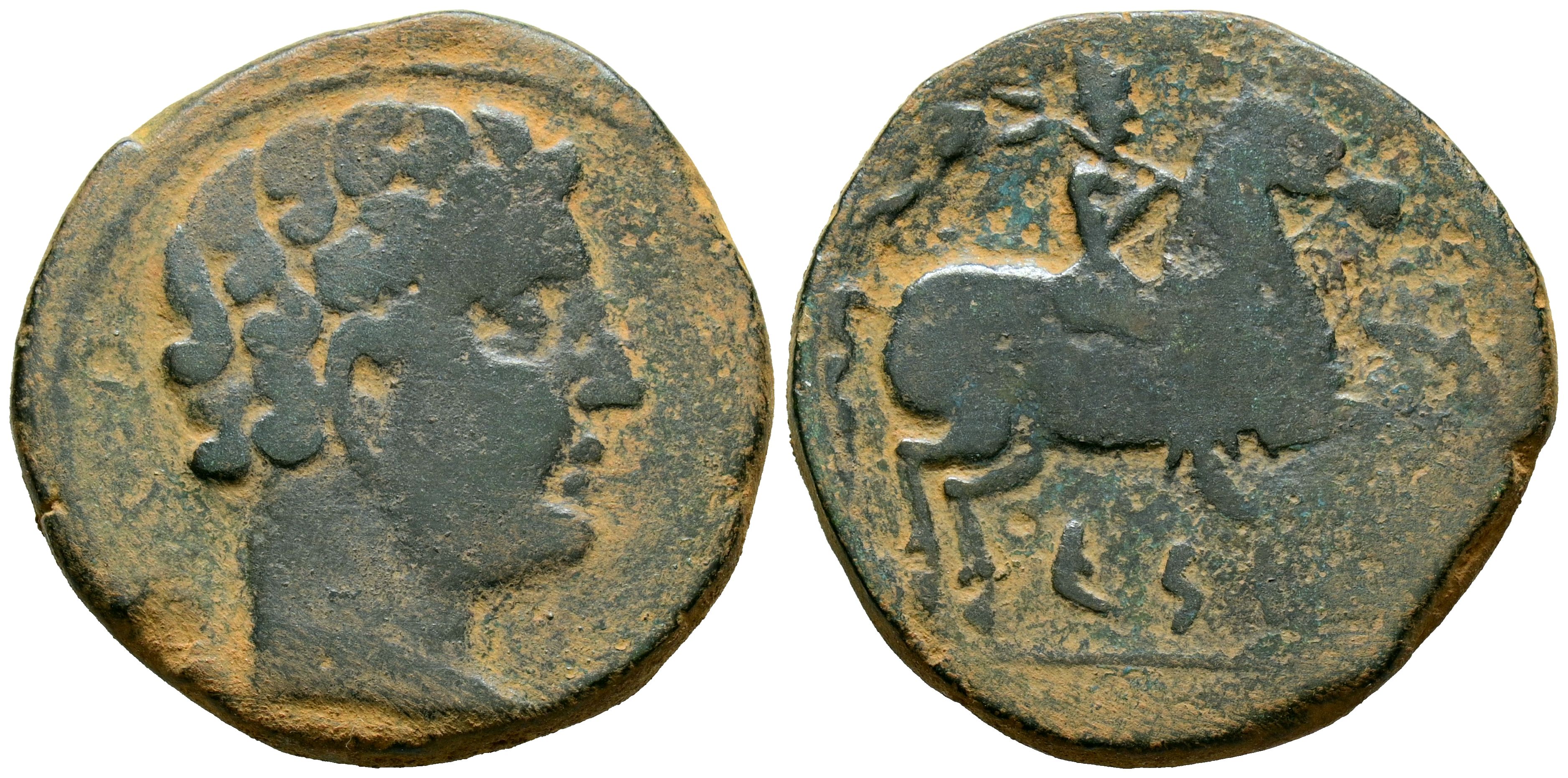CESE (Tarragona). As. (Ae. 11,87g/26mm). 120-20 a.C. (FAB-2270). Anv: Cabeza masculina a derecha. Rev: Jinete con palma a derecha, debajo leyenda ibérica: CeSE. MBC-. Tierra añadida.
