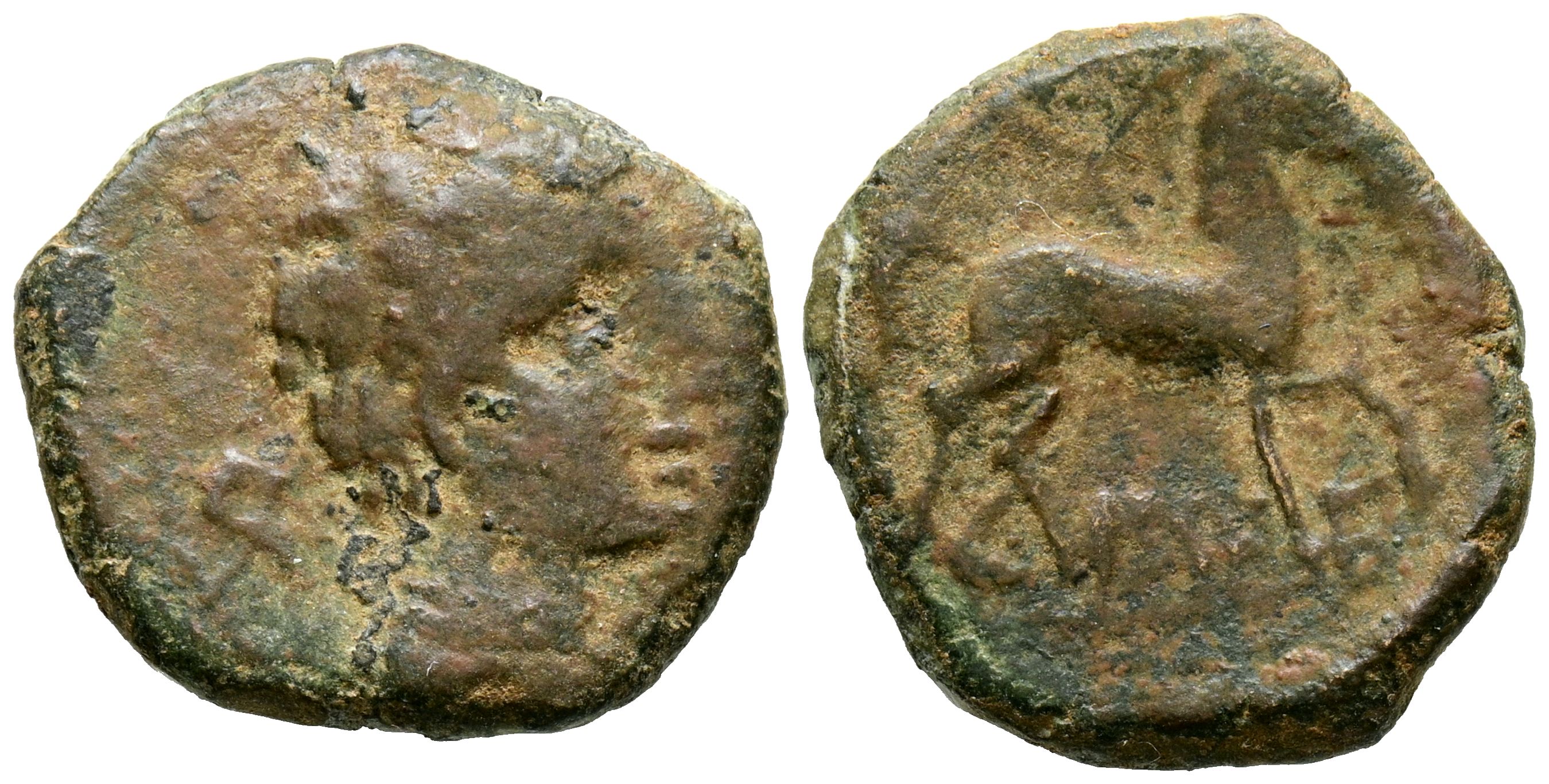 CESE (Tarragona). Semis. (Ae. 4,47g/19mm). 110-20 d.C. (FAB-2353). Anv: Cabeza masculina a derecha, detrás letra ibérica Be. Rev: Caballo a derecha, debajo leyenda ibérica: CESSE. MBC-.