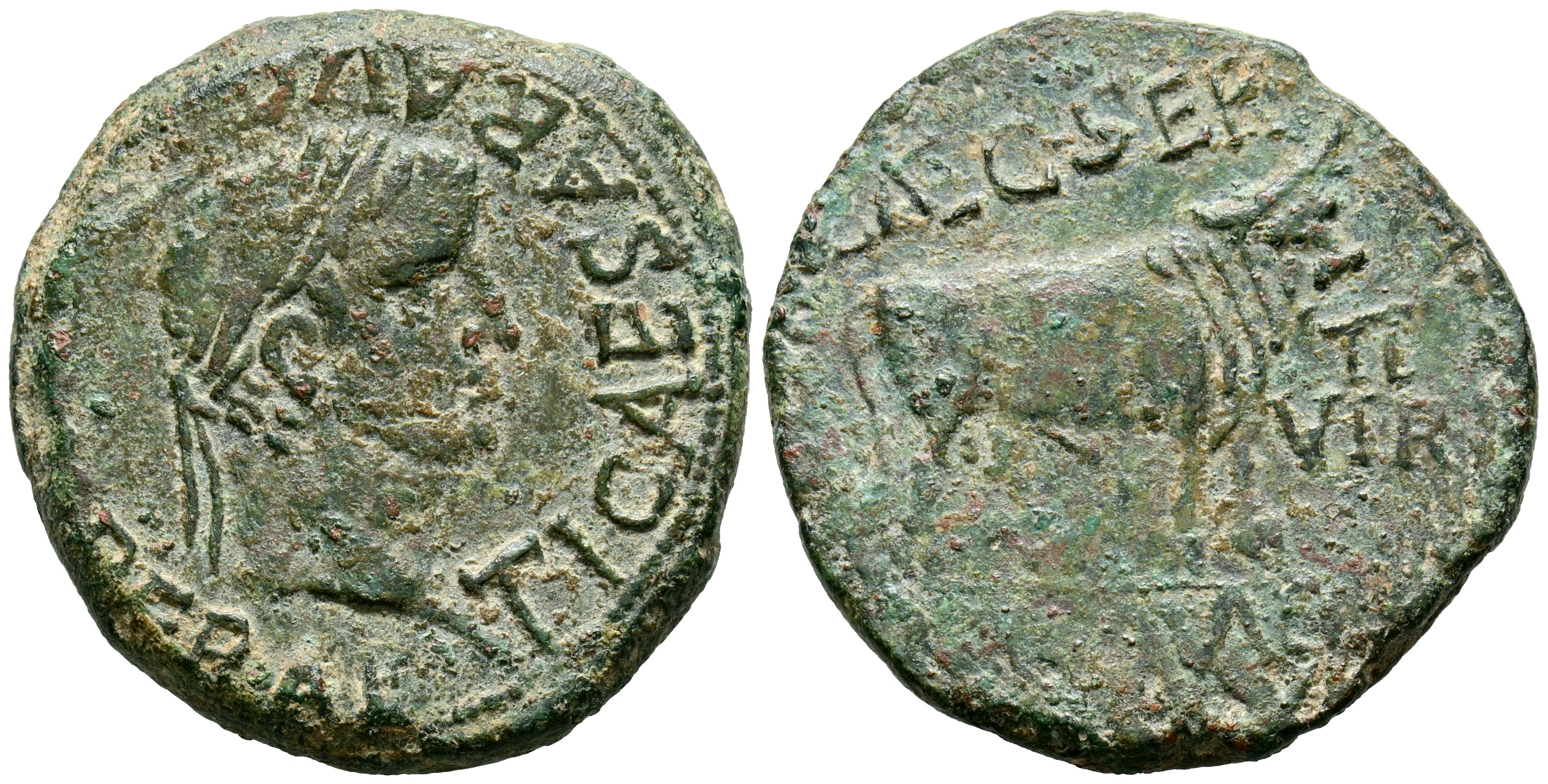 TURIASO (Tarazona, Zaragoza). As. (Ae. 13,45g/28mm). 14-36 d.C. (FAB-2452). Anv: Cabeza laureada de Tiberio a derecha, alrededor leyenda: TI CAESAR AVGVST F IMPERAT. Rev: Toro a derecha, encima: C CAEC SER, debajo: M VAL QVAD, a los lados: MVN TVR- II VIR. MBC.