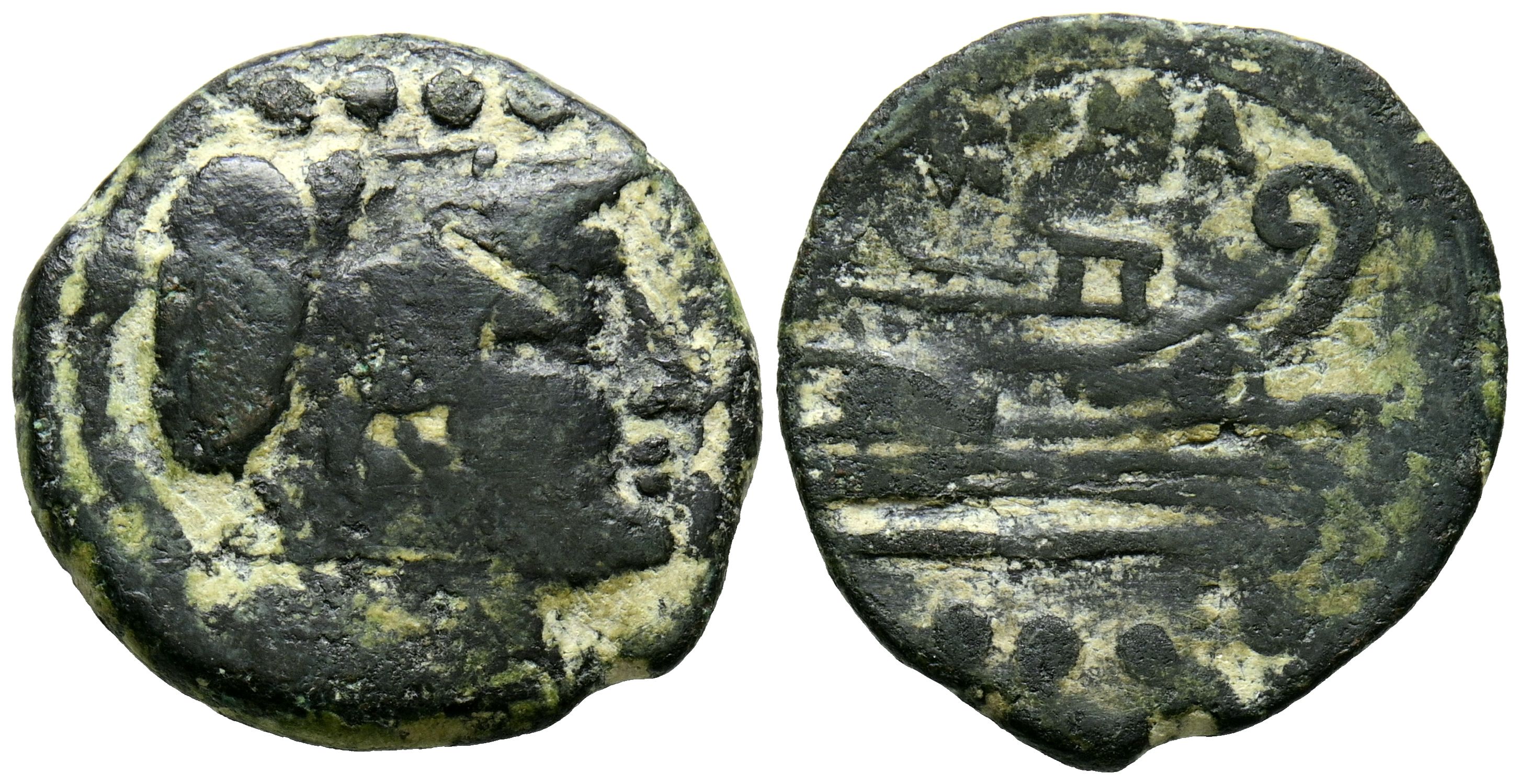 ACUÑACIONES ANONIMAS. Triente. (Ae. 4,35g/21mm). 215-212 a.C. Roma. (Crawford 56/4). Anv: Cabeza de Roma a derecha, encima cuatro puntos. Rev: Proa a derecha, encima leyenda: ROMA, debajo cuatro puntos. BC+.