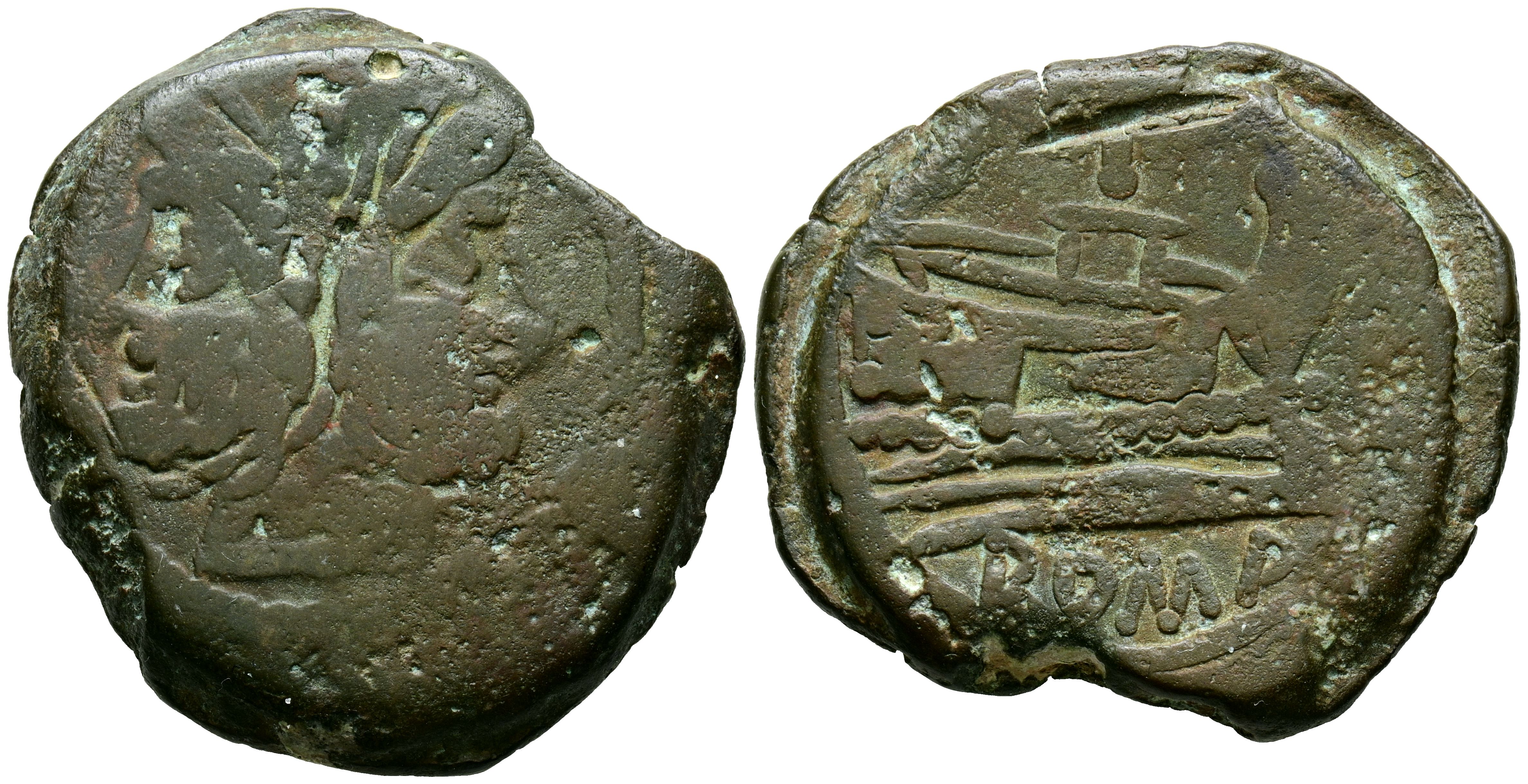 ACUÑACIONES ANONIMAS. As. (Ae. 27,04g/35mm). 209-208 a.C. Roma. (Crawford 50/3). Anv: Cabeza bifronte laureada de Jano, encima: I. Rev: Proa a derecha, encima: I, delante ancla, debajo: ROMA. MBC-. Cospel faltado
