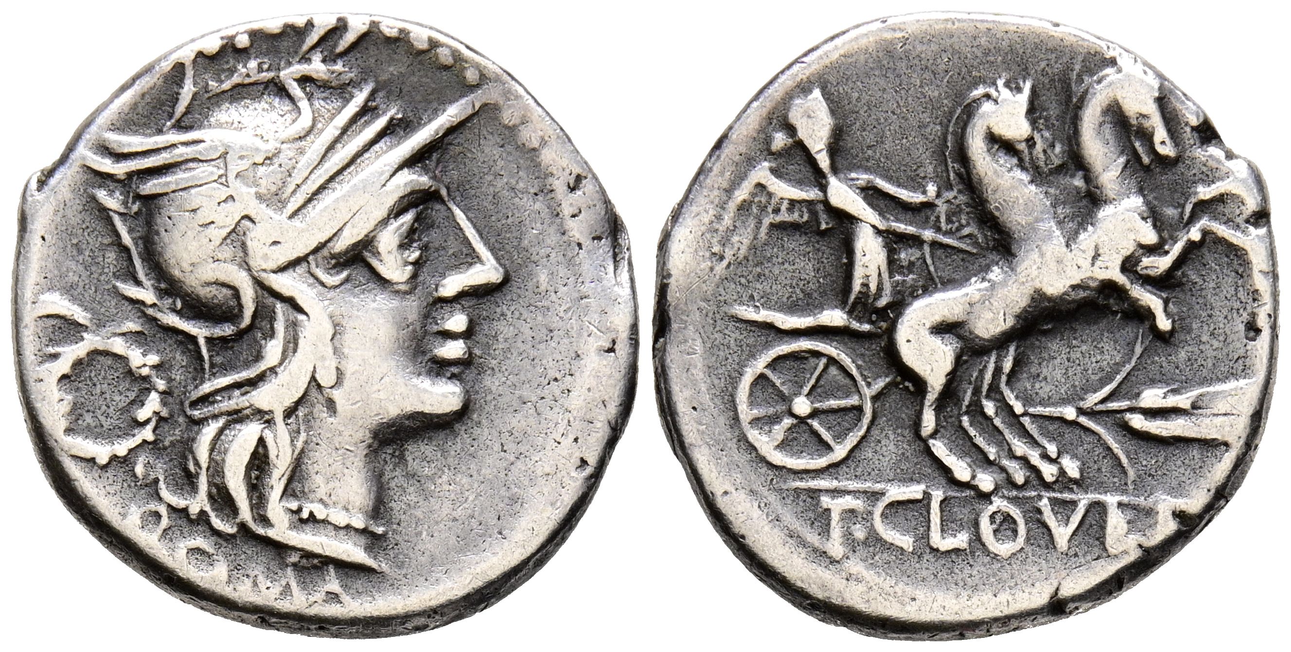 GENS CLOULIA. Denario. (Ar. 3,64g/18mm). 128 a.C. Roma. (FFC 572; Crawford 260/1). Anv: Cabeza de Roma a derecha, detrás corona de laurel, debajo leyenda: ROMA. Rev: Victoria dirigiendo biga a derecha, debajo espiga, en exergo: T CLOVLI. MBC-.