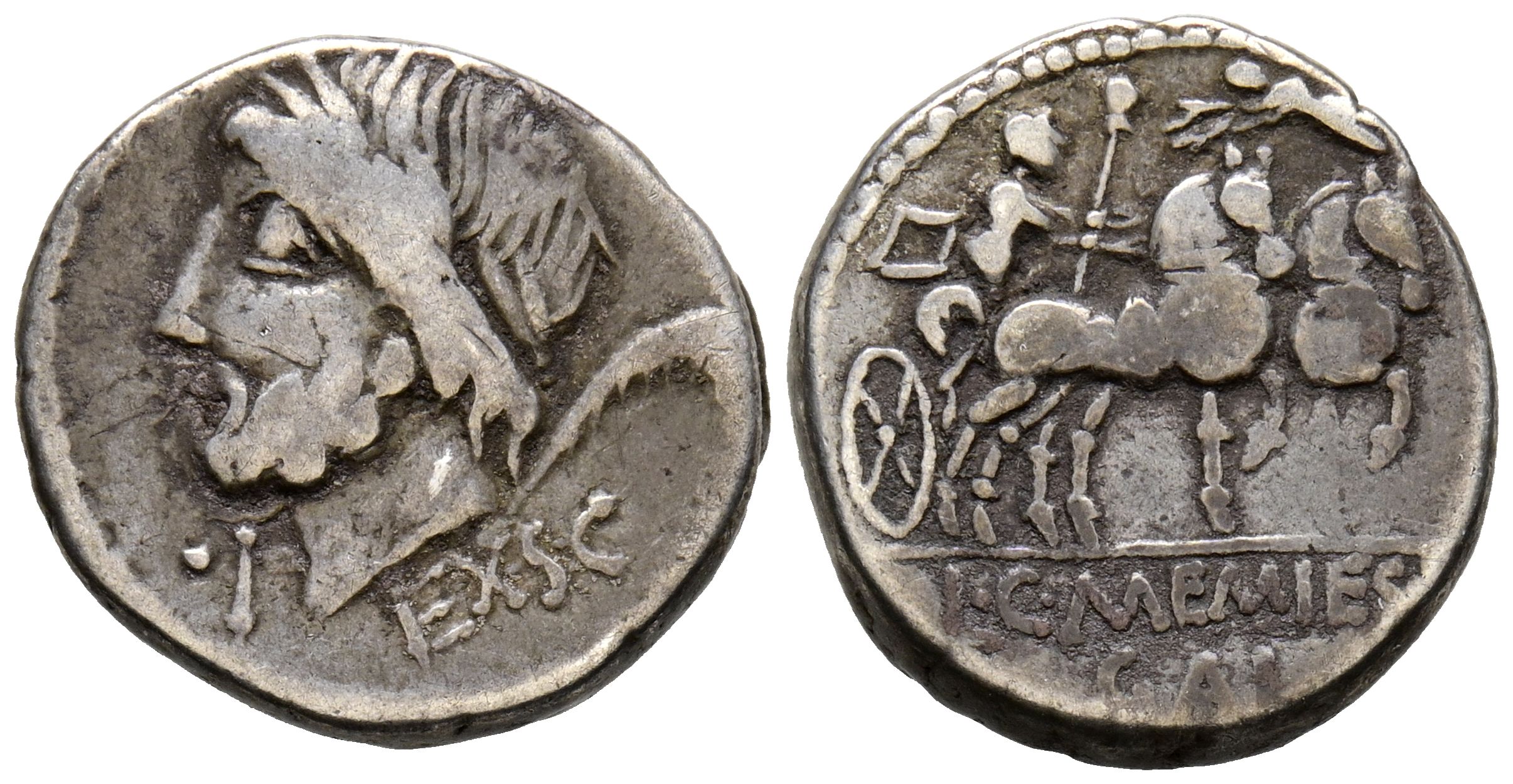 GENS MEMMIA. Denario. (Ar. 4,03g/17mm). 87 a.C. Roma. (FFC 911; Crawford 349/1). Anv: Cabeza laureada de Saturno a izquierda, delante: tres puntos y I, detrás arpa, debajo leyenda: EX SC. Rev: Venus con cetro en biga a derecha, coronada por Victoria volando sobre los caballos, en exergo: L C MEMMIES LF GAL. MBC-.
