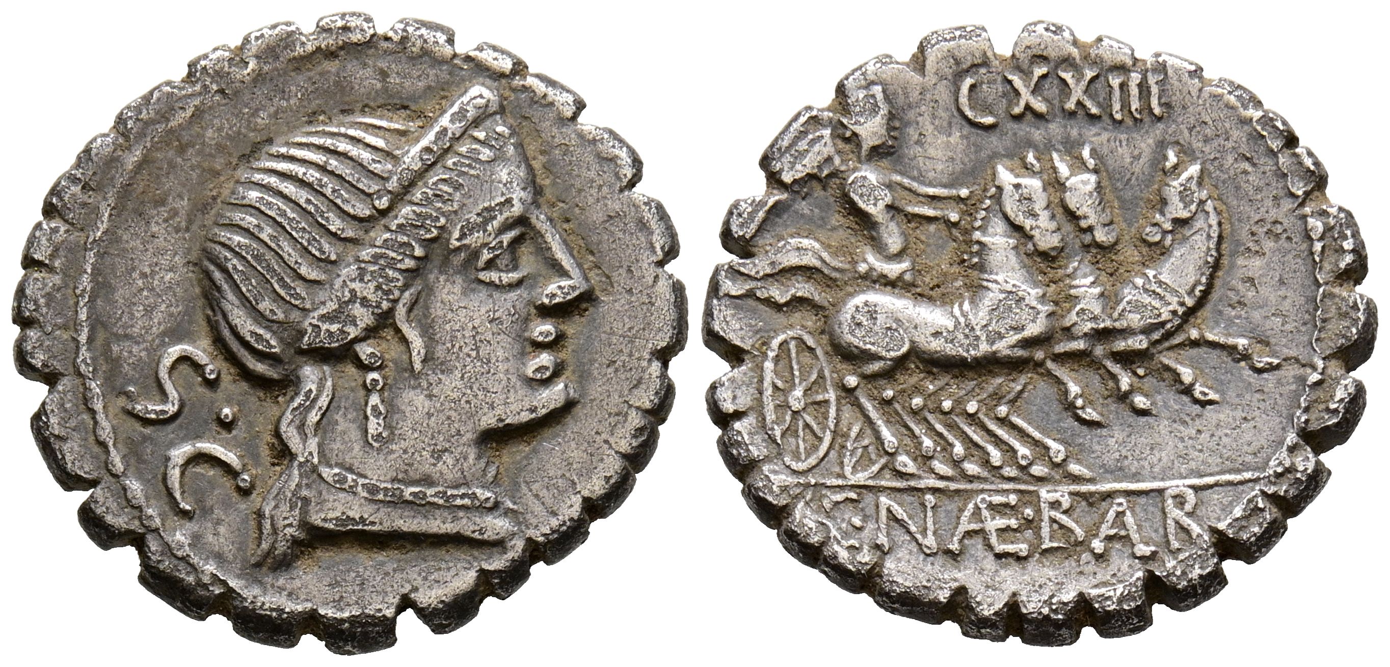 GENS NAEVIA. Denario. (Ar. 3,70g/19mm). 79 a.C. Taller auxiliar de Roma. (FFC 937; Crawford 382/1). Anv: Cabeza diademada de Venus a derecha, detrás SC. Rev: Victoria conduciendo triga a derecha, encima: XXVIIII, en exergo: C NAE BALB. MBC.