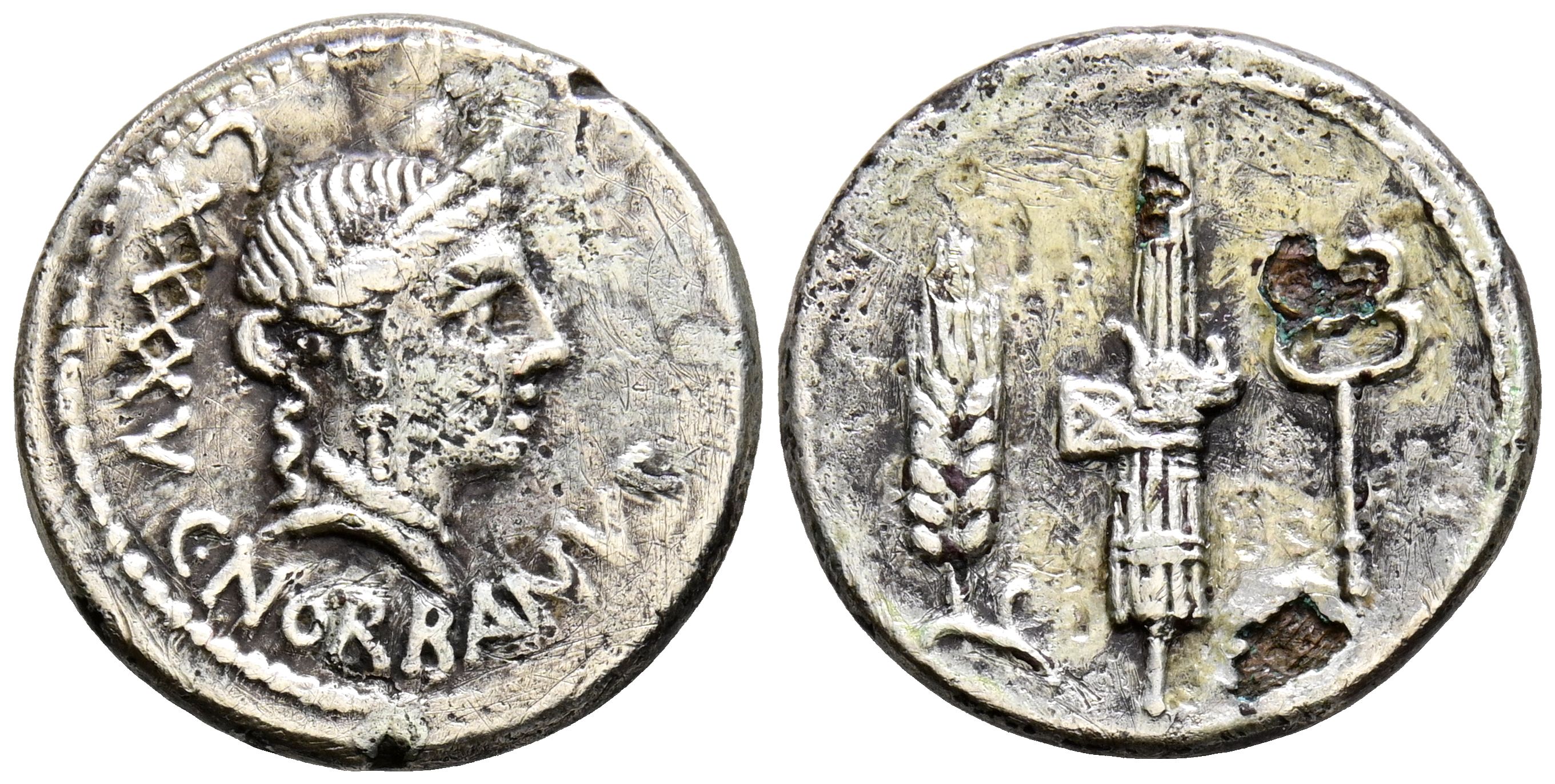 GENS NORBANA. Denario forrado. (Ar-Ae. 3,37g/19mm). 83 a.C. Roma. (Crawford 357/1b; FFC 943). Anv: Cabeza diademada de Venus a derecha, detrás número: CXXXVIII, debajo leyenda: C NORBANVS. Rev: Fasces con hacha entre espiga y caduceo. MBC-.