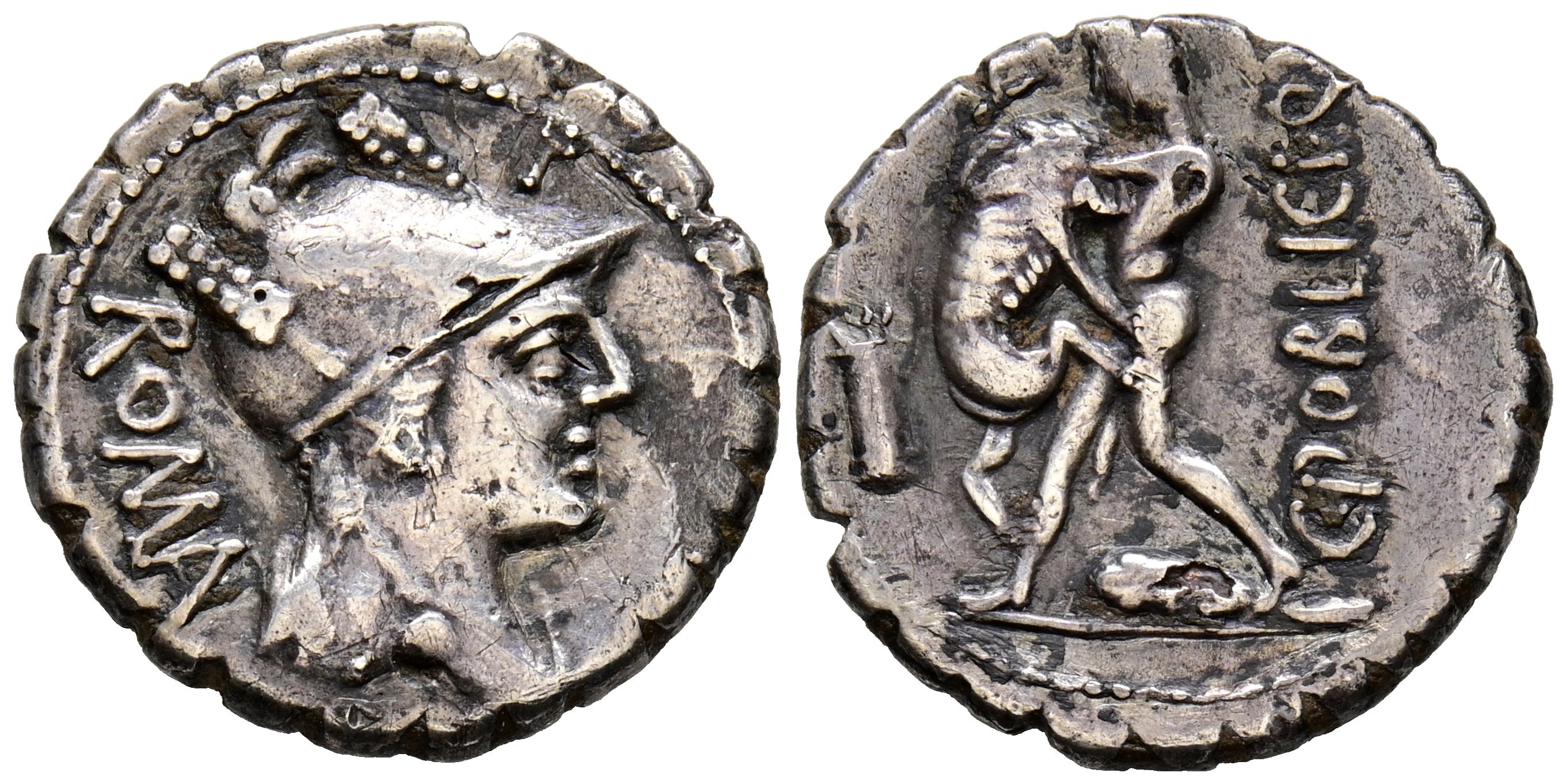 GENS POBLICIA. Denario forrado. (Ar-Ae. 3,11g/19mm). 80 a.C. Taller auxiliar de Roma. (FFC 1017; Crawford 380/1). Anv: Cabeza de Roma a derecha, encima: H, detrás leyenda: ROMA. Rev: Hércules estante a izquierda estrangulando al león de Nemea, delante: mazo, arco y carcaj, encima: H, detrás leyenda: C POBLICI Q F. MBC.
