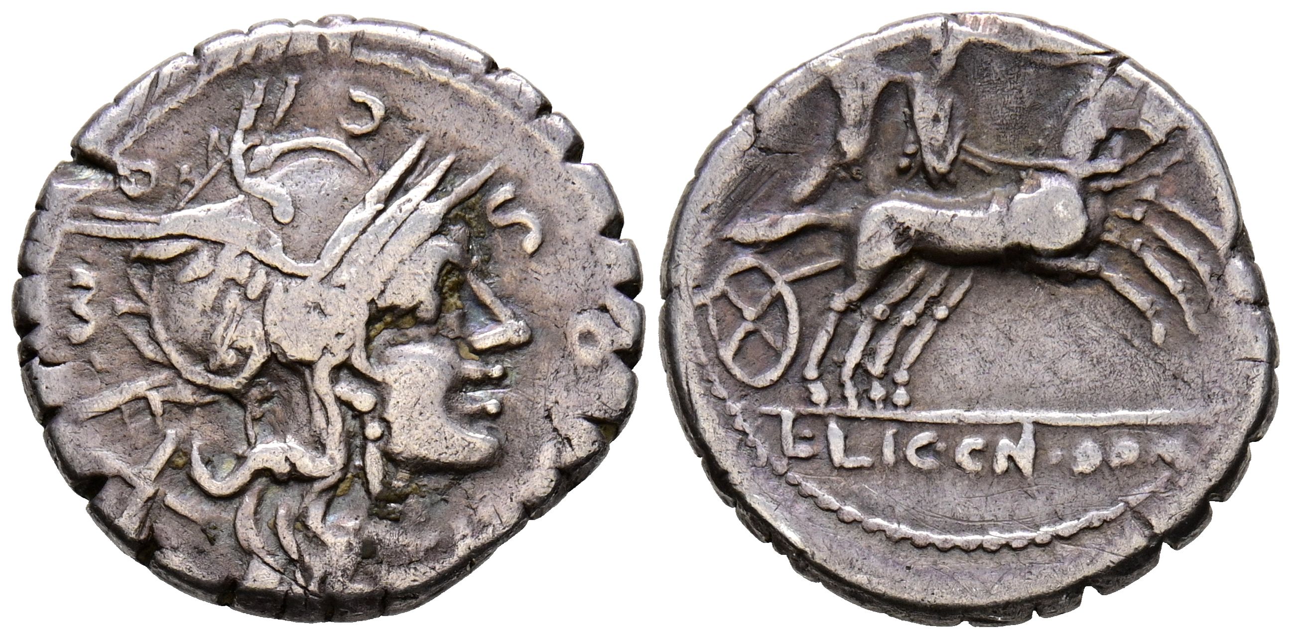 GENS POMPONIA. Denario. (Ar. 3,77g/18mm). 118 a.C. (FFC 1027; Crawford 282/4). Anv: Cabeza de Roma a derecha, alrededor leyenda: L POMPONI CN F. Rev: Guerrero Bituito con escudo y carnyx conduciendo biga lanzando jabalina, en exergo: L LIC CN DOM. MBC-.