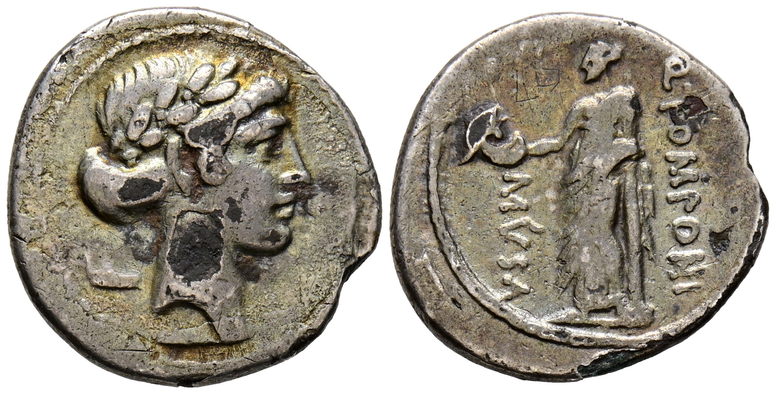 GENS POMPONIA. Denario forrado. (Ar-Ae. 3,06g/19mm). 66 a.C. (FFC 1048; Crawford 410/9a). Anv: Cabeza laureada de Apolo a derecha, detrás coturno. Rev: La musa Thalia estante a izquierda portando máscara y cayado, apoyada en columna, alrededor leyenda: Q POMPONI MVSA. MBC-.
