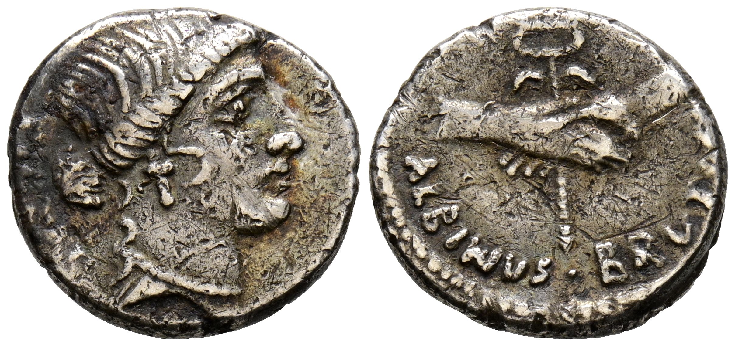 GENS POSTUMIA. Denario. (Ar. 3,74g/17mm). 48 a.C. Roma. (FFC 1075; Crawford 450/2). Anv: Cabeza de Pietas a derecha, detrás leyenda: PIETAS. Rev: Dos manos entrelazadas sosteniendo un caduceo, debajo leyenda: ALBINVS BRVTI F. MBC. Pátina oscura.