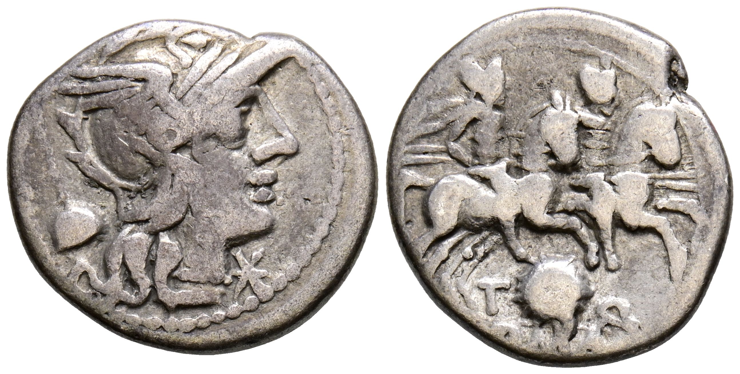 GENS QUINCTIA. Denario. (Ar. 3,70g/19mm). 126 a.C. Roma. (FFC 1084; Crawford 267/1). Anv: Cabeza de Roma a derecha, delante estrella, detrás bonete de flamen. Rev: Los Dioscuros a caballo, encima estrella, debajo escudo macedonico entre T y Q, en exergo: ROMA. MBC-.