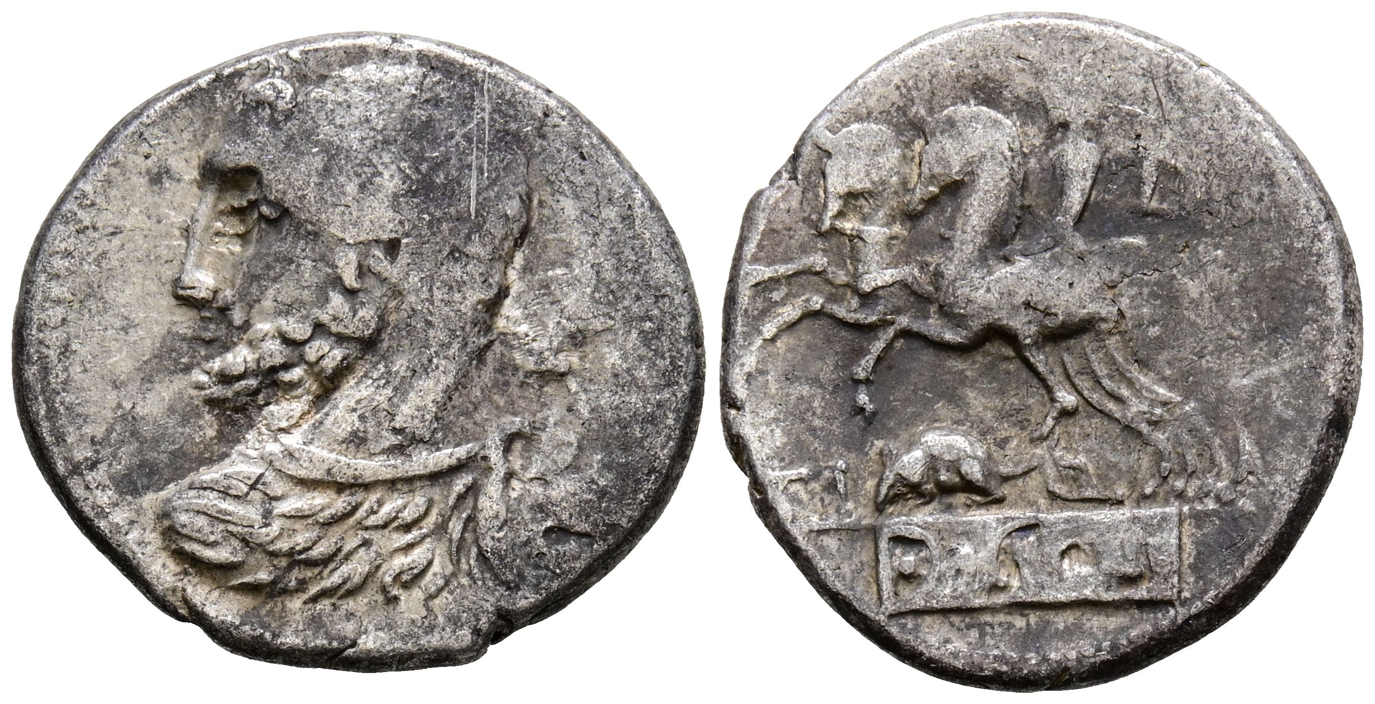 GENS QUINCTIA. Denario. (Ar. 3,87g/19mm). 112-111 a.C. Italia Central. (FFC 1086; Crawford 297/1). Anv: Busto de Hércules a izquierda con maza su hombro derecho. Rev: Jinete conduciendo dos caballos a izquierda, debajo rata a izquierda, entre TI-Q, encima letra B, en exergo: D S S. BC+.