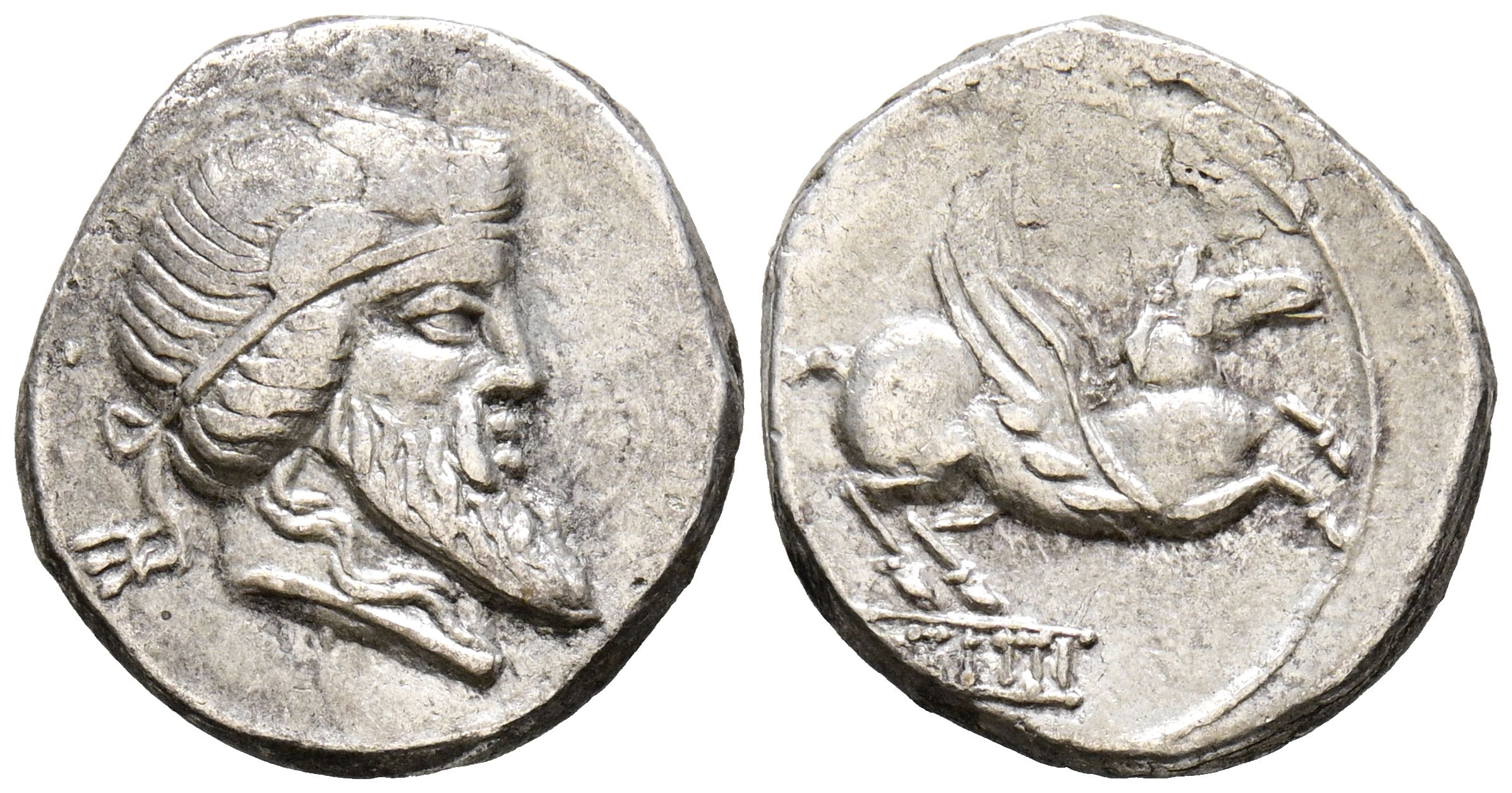 GENS TITIA. Denario. (Ar. 3,69g/17mm). 90 a.C. Italia central. (FFC 1142; Crawford 341/1). Anv: Cabeza del dios Mutinus Titinus a derecha. Rev: Pegaso a derecha, debajo leyenda: Q TITI. MBC+.