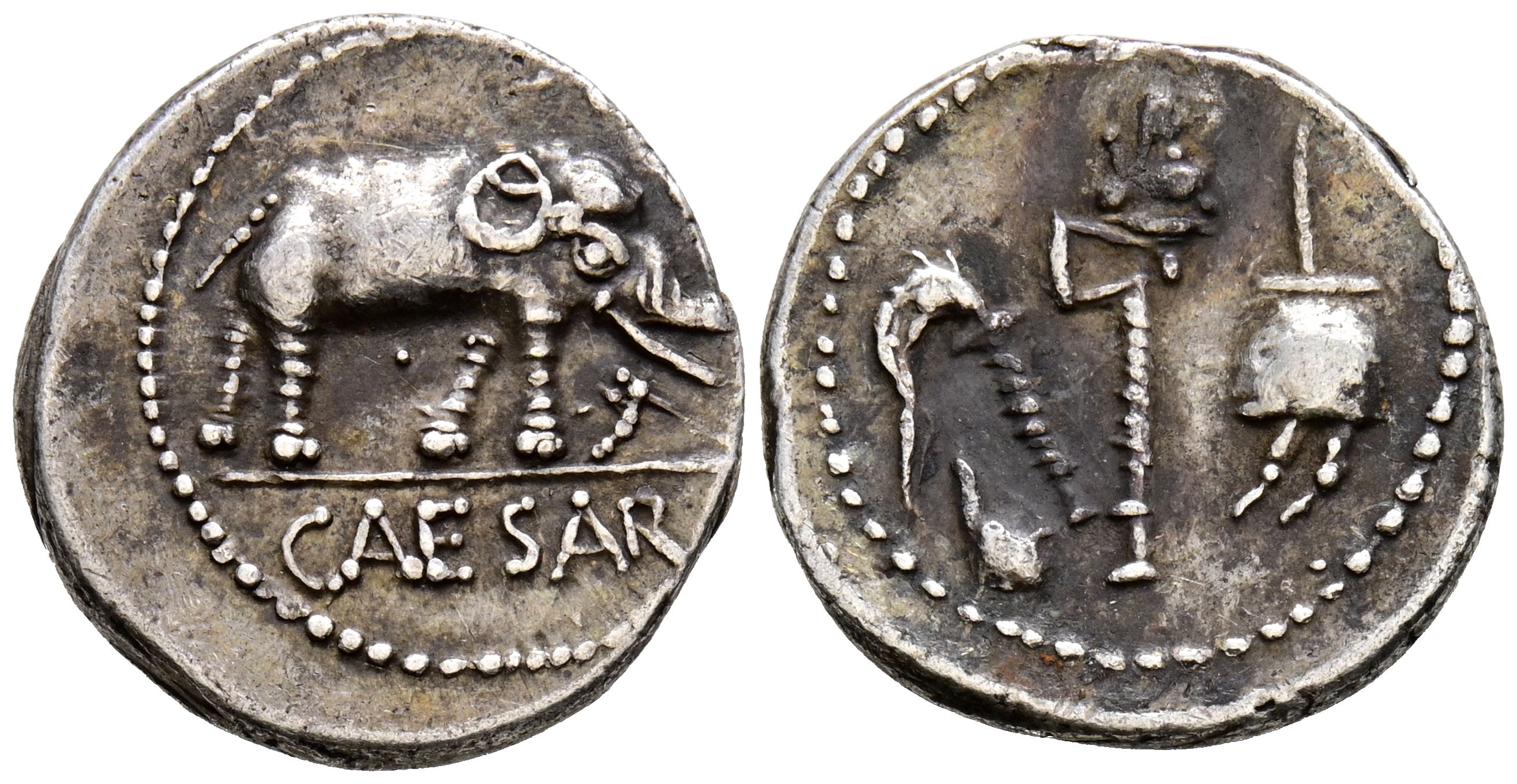 JULIO CESAR. Denario. (Ar. 3,70g/18mm). 49-48 a.C. Ceca militar móvil. (FFC 50; Crawford 443/1). Anv: Elefante avanzando a derecha, delante serpiente, debajo leyenda: CAESAR. Rev: Emblemas del pontificado: simpulum, aspergilum, securis (coronado por carbeza de lobo) y apex. MBC.