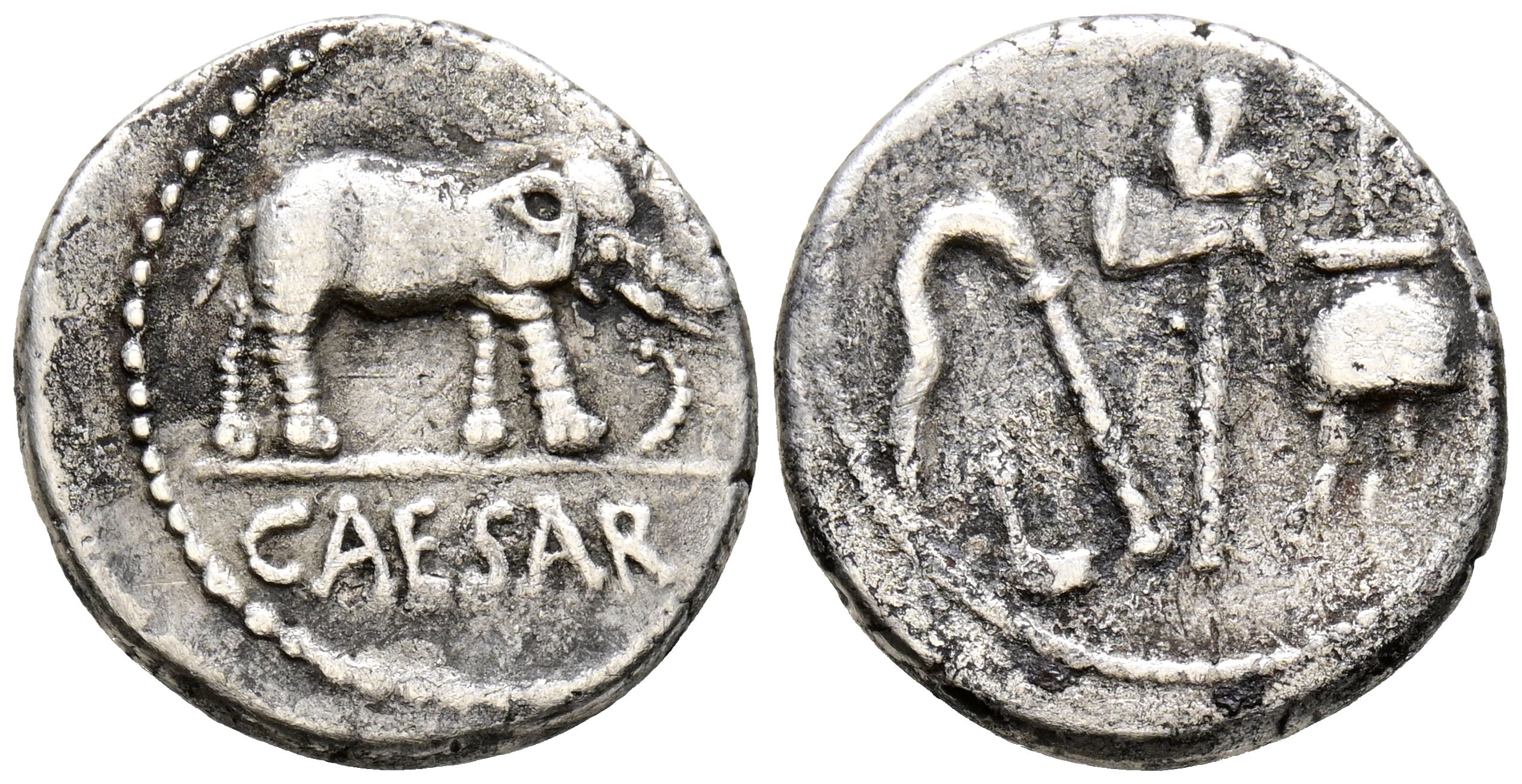 JULIO CESAR. Denario. (Ar. 3,80g/18mm). 49-48 a.C. Ceca militar móvil. (Crawford 443/1). Anv: Elefante avanzando a derecha, delante serpiente, debajo leyenda: CAESAR. Rev: Emblemas del pontificado: simpulum, aspergilum, securis (coronado por carbeza de lobo) y apex. MBC-. Escaso ejemplar.