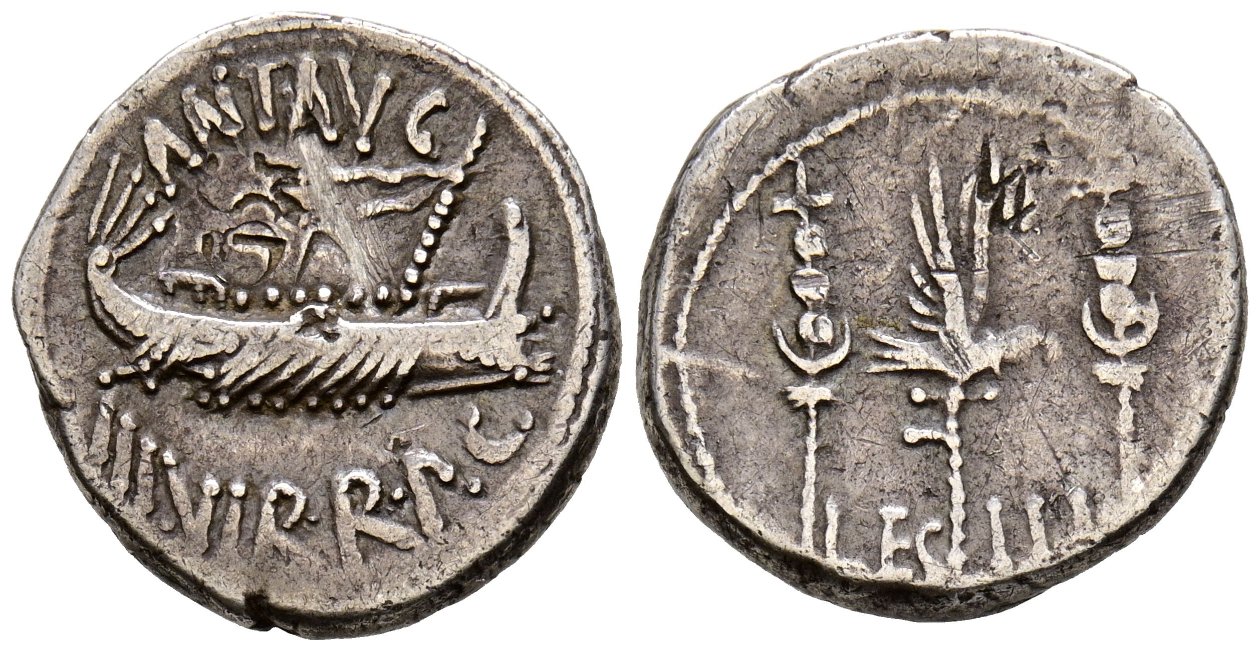 MARCO ANTONIO. Denario. (Ar. 3,45g/17mm). 32-31 a.C. Ceca volante. (FFC 33; Crawford 544/15). Anv: Galera Pretoriana a derecha, alrededor leyenda: ANT AVG III VIR RPC. Rev: Aguila legionaria entre dos estandartes, entre ellas: LEG-III. MBC/MBC-. Contramarcas en anverso.