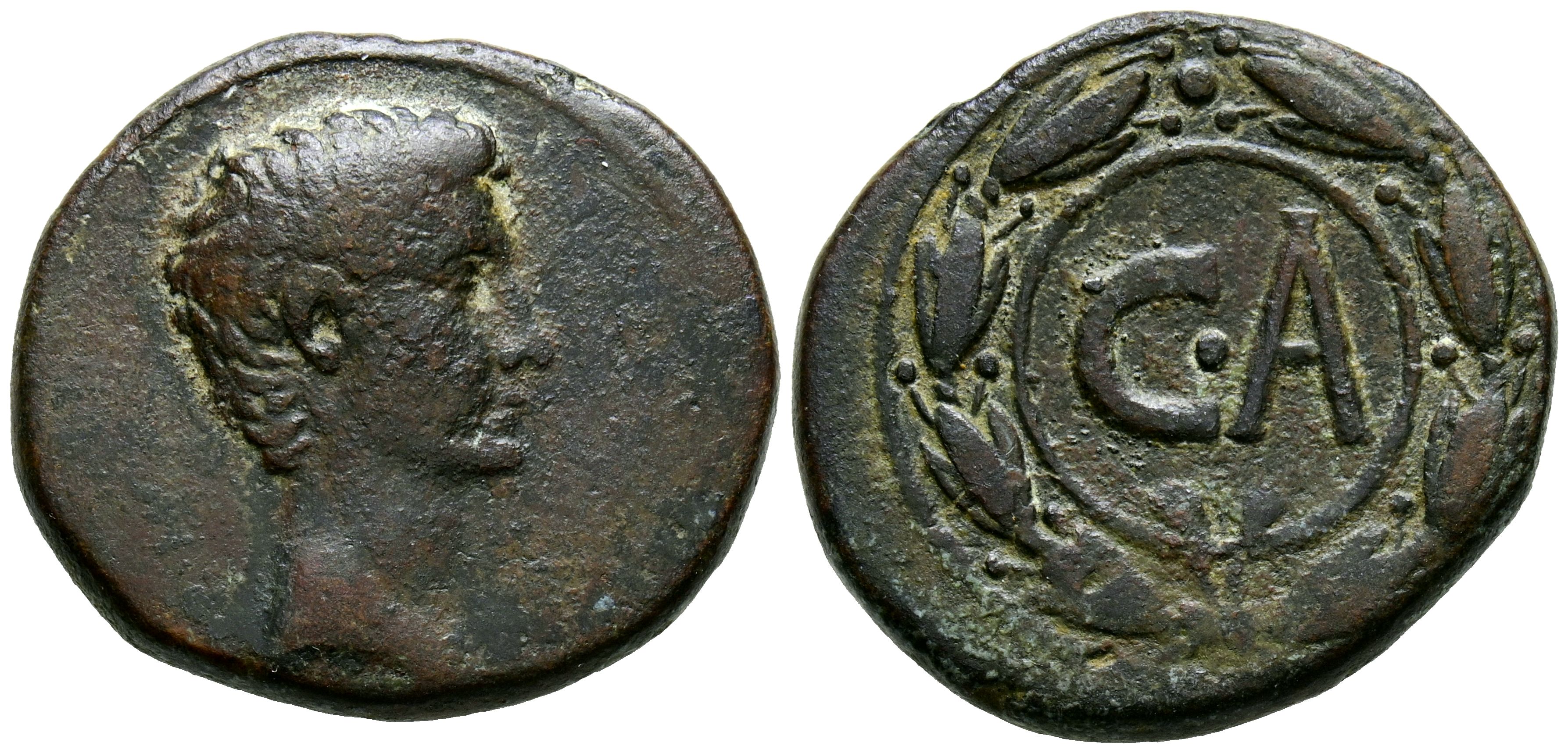 AUGUSTO. Ae25. (Ae. 9,02g/25mm). 27 a. C. Ceca incierta, Asia Menor. (RPC 2230; RIC 497). Anv: Cabeza descubierta de Augusto a derecha, alrededor leyenda: IMP CAESAR. Rev: CA dentro del círculo, todo dentro de una corona de laurel. MBC.Ex Roma Numismatics, E-Sale 52 (10/01/2019), Lot 493.