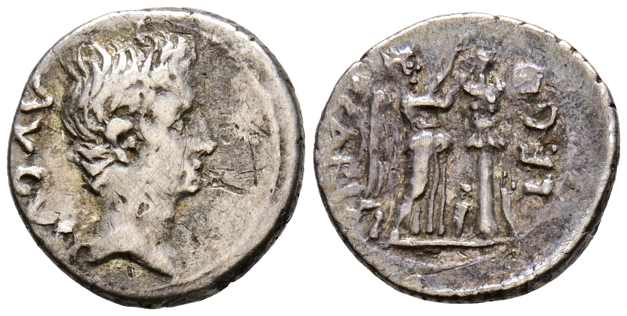 AUGUSTO. Quinario. (Ar. 1,80g/14mm). 25-23 a.C. Emérita Augusta. (RIC 1a). Anv: Cabeza de Augusto a derecha, detrás leyenda: AVGVSTVS. Rev: Victoria estante a derecha coronando trofeo, alrededor leyenda: P CARISI LEG. MBC.