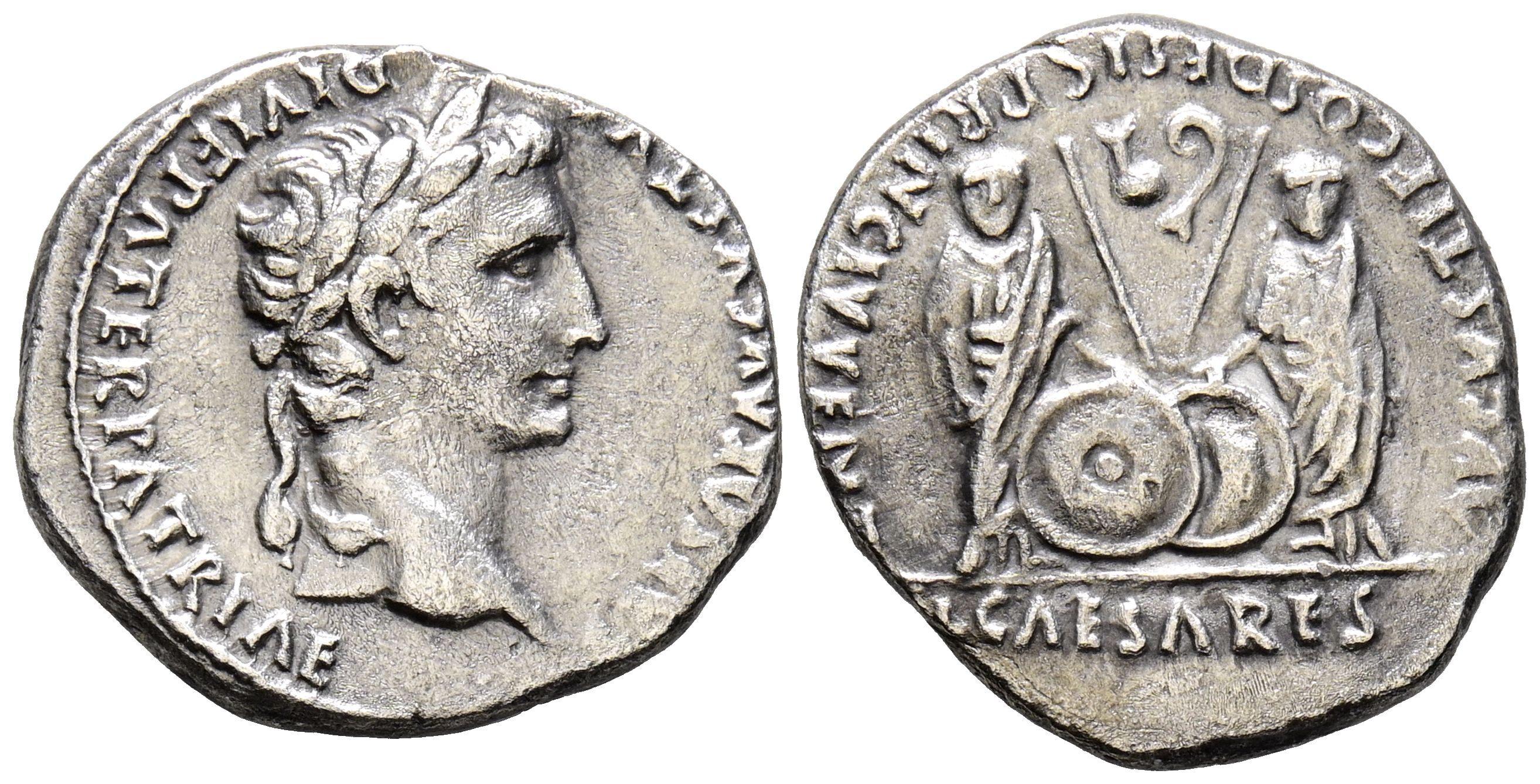 AUGUSTO. Denario. (Ar. 3,43g/18mm). 7-6 a.C. (RIC 207). Anv: Cabeza laureada de Augusto a derecha, alrededor leyenda: CAESAR AVGVSTVS DIVI F PATER PATRIAE. Rev: Cayo y Lucio estantes de frente, entre ellos escudo y lanzas, en campo símpulo y lítuo, en exergo: CL CAESARES, alrededor leyenda: AVGVSTI F COS DESIG PRINC IVVENT. MBC. Porosidad.