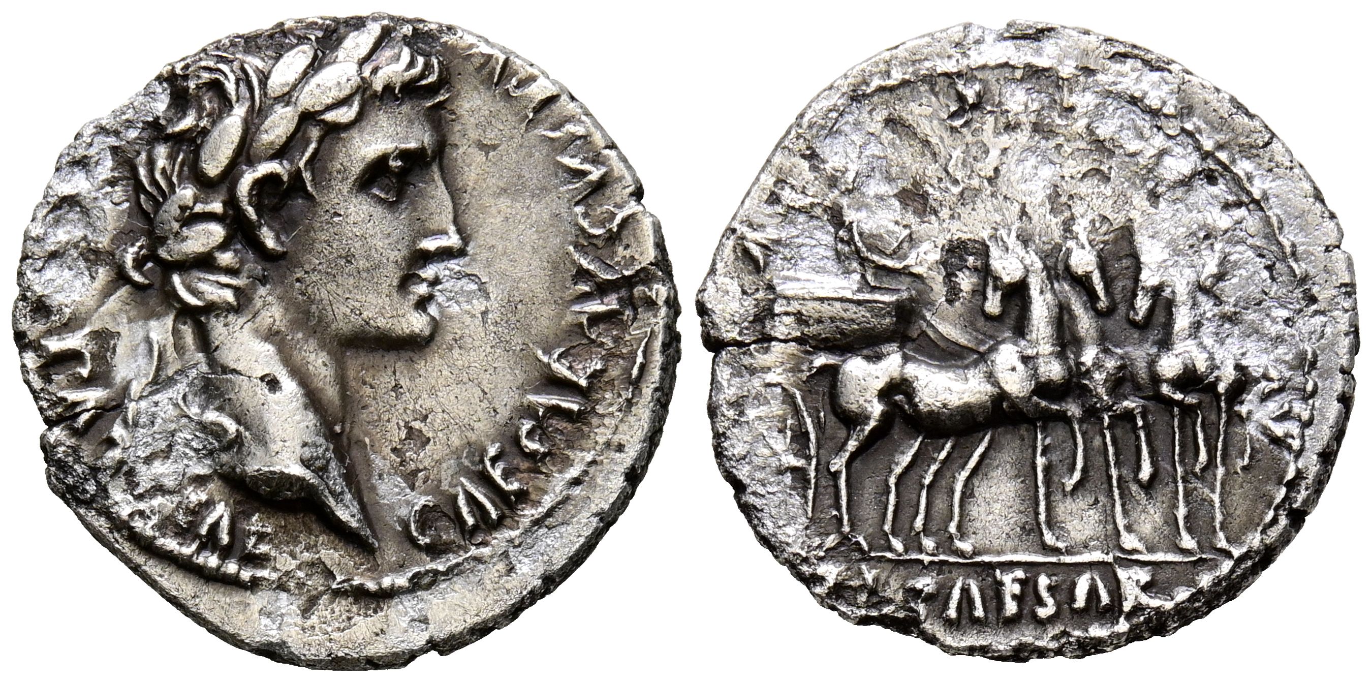 AUGUSTO. Denario. (Ar. 3,39g/19mm). 13-14 d.C. Lugdunum. (RIC 222). Anv: Cabeza laureada de Augusto a derecha, alrededor leyenda: CAESAR AVGVSTVS DIVI F PATER PATRIAE. Rev: Tiberio con cetro de águila conduciendo cuádriga a derecha, alrededor leyenda: AVG F TR POT XV, en exergo: TI CAESAR. MBC. Oxidaciones limpiadas. Escaso ejemplar.