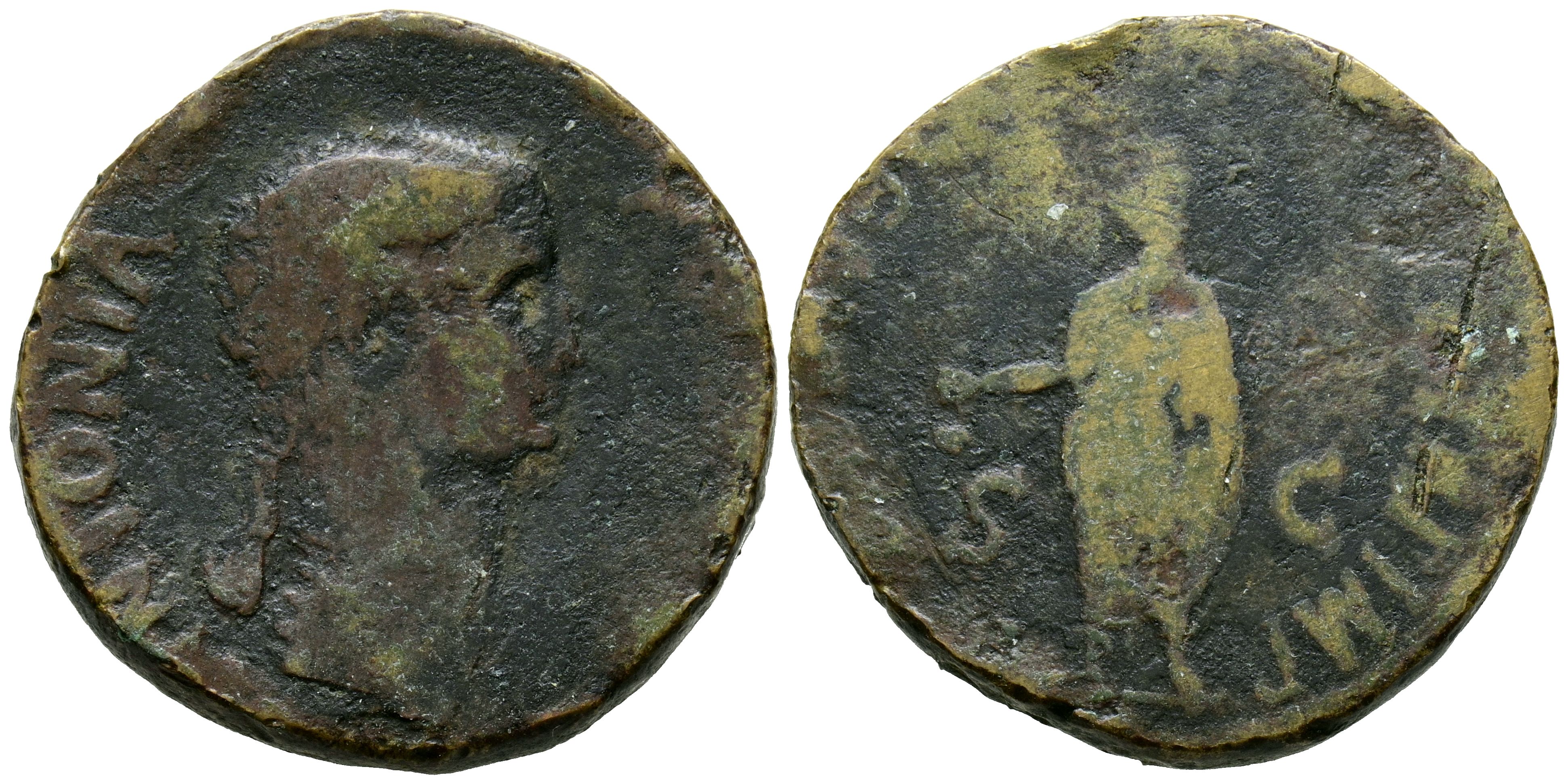 ANTONIA. Dupondio (Ae. 12.62g/27mm). 41-42 d.C. Roma. (RIC 92). Anv: Busto descubierto a la derecha de Antonia, alrededor leyenda: ANTONIA AVGUST. Rev: Claudio velado y estante a izquierda con el símpulo, en campo: S-C, alrededor leyenda: TI CLAVDIVS CAESAR AVG P M TR P IMP. BC.