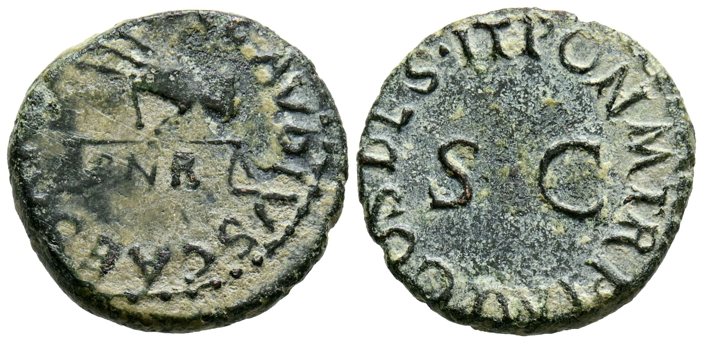 CLAUDIO I. Cuadrante. (Ae. 4,15g/15mm). 41 d.C. Roma. (RIC 85). Anv: Mano sosteniendo balanza, alrededor leyenda: TI CLAVDIVS CAESAR AVG. Rev: SC, alrededor leyenda: PON M TR P IMP COS DES IT. MBC/MBC+.