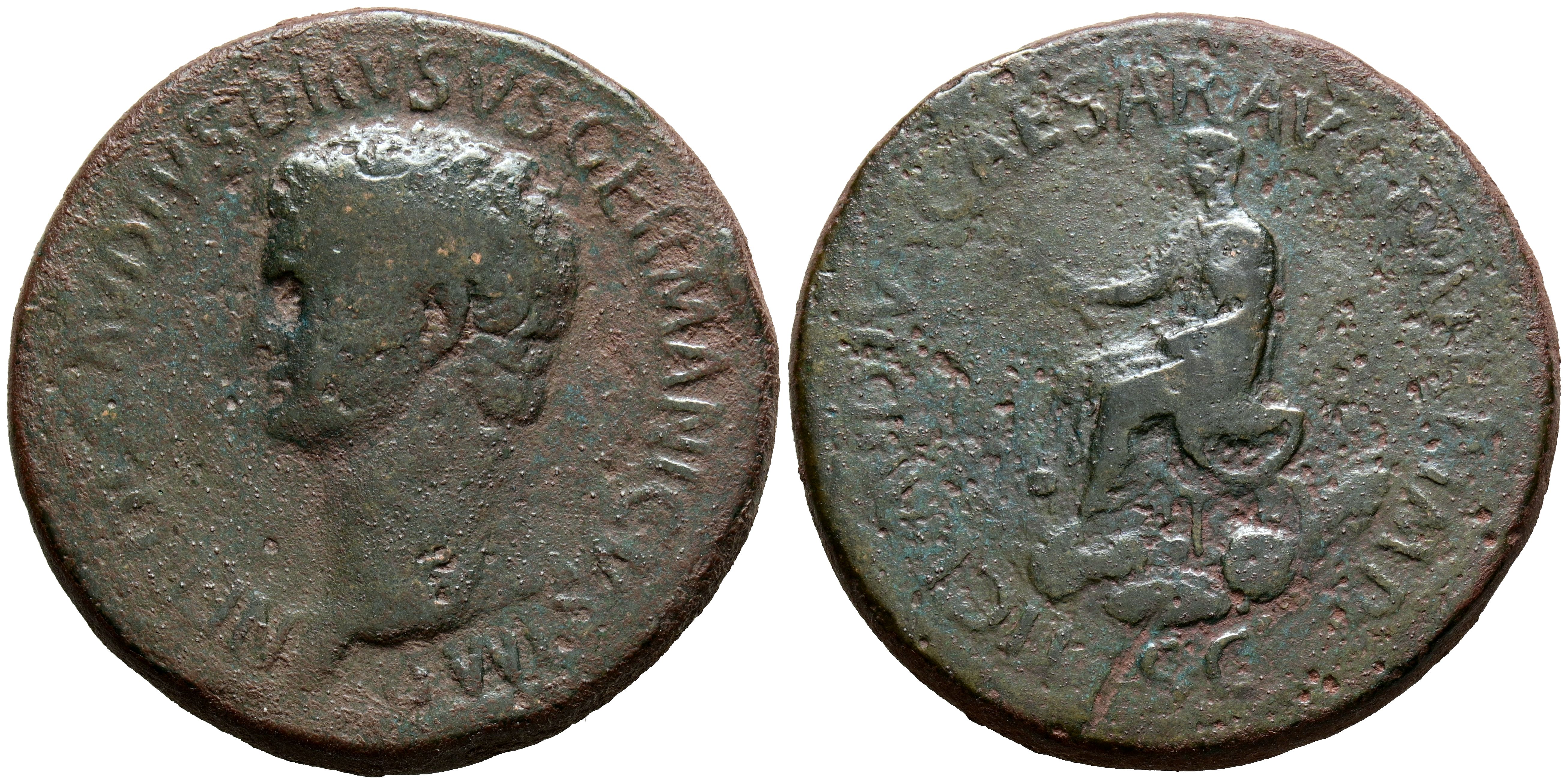 NERO DRUSO, en época de Claudio I. Sestercio. (Ae. 28,47g/37mm). 41-50 d.C. (RIC 93). Anv: Cabeza de Claudio I a izquierda, alrededor leyenda: NERO CLAVDIVS DRVSVS GERMANICVS IMP. Rev: Claudio I sentado a izquierda sobre silla curul portando rama, debajo armas, alrededor leyenda: TI CLAVDIVS CAESAR AVG P M TR P IMP. BC-.