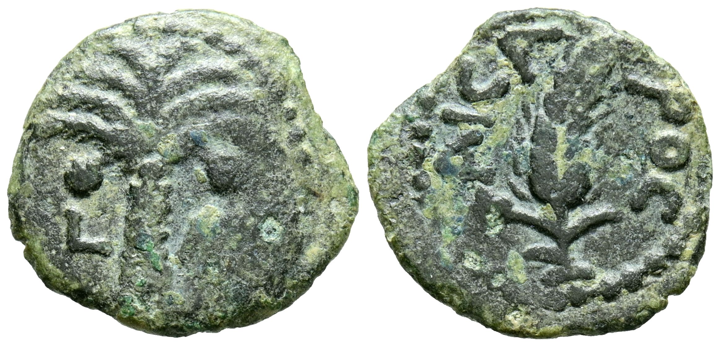 JUDAEA, Marco Ambulo, bajo Augusto. Prutah. (Ae. 1,55g/16mm). 8-9 d.C. Jerusalén. (RPC 4955; Hendin 1329). Anv: Palmera, entre: L-N. Rev: Mazorca de grano, alrededor leyenda: KAICAPOC. MBC.