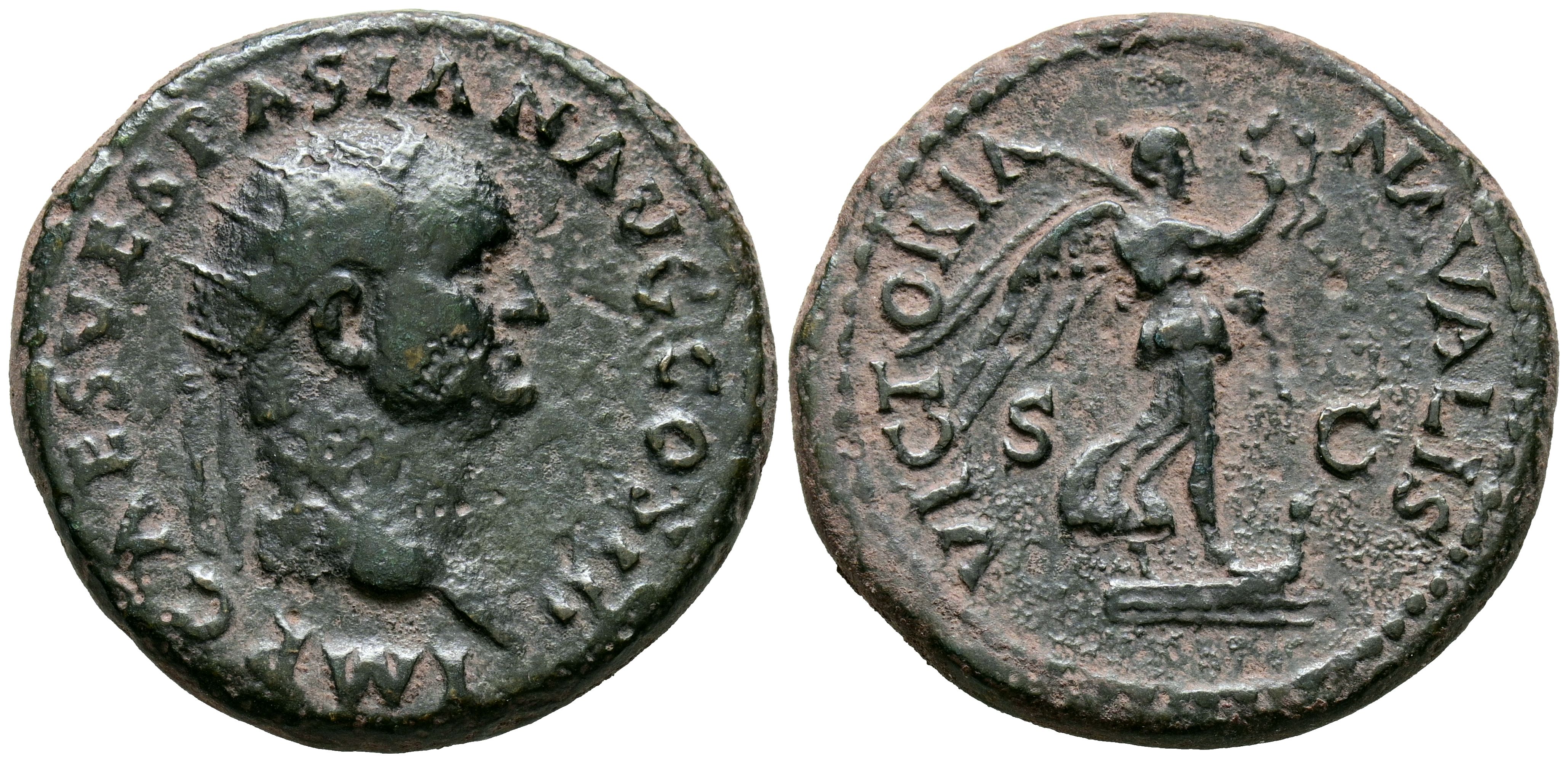 VESPASIANO. Dupondio. (Ae. 14,16g/29mm). 71 d.C. Lugdunum. (RIC 1159). Anv: Cabeza radiada de Vespasiano a derecha, alrededor leyenda: IMP CAES VESPASIAN AVG COS III. Rev: Victoria avanzando a derecha con corona de laurel sobre proa, entre: S-C, alrededor leyenda: VICTORIA NAVALIS. MBC-.