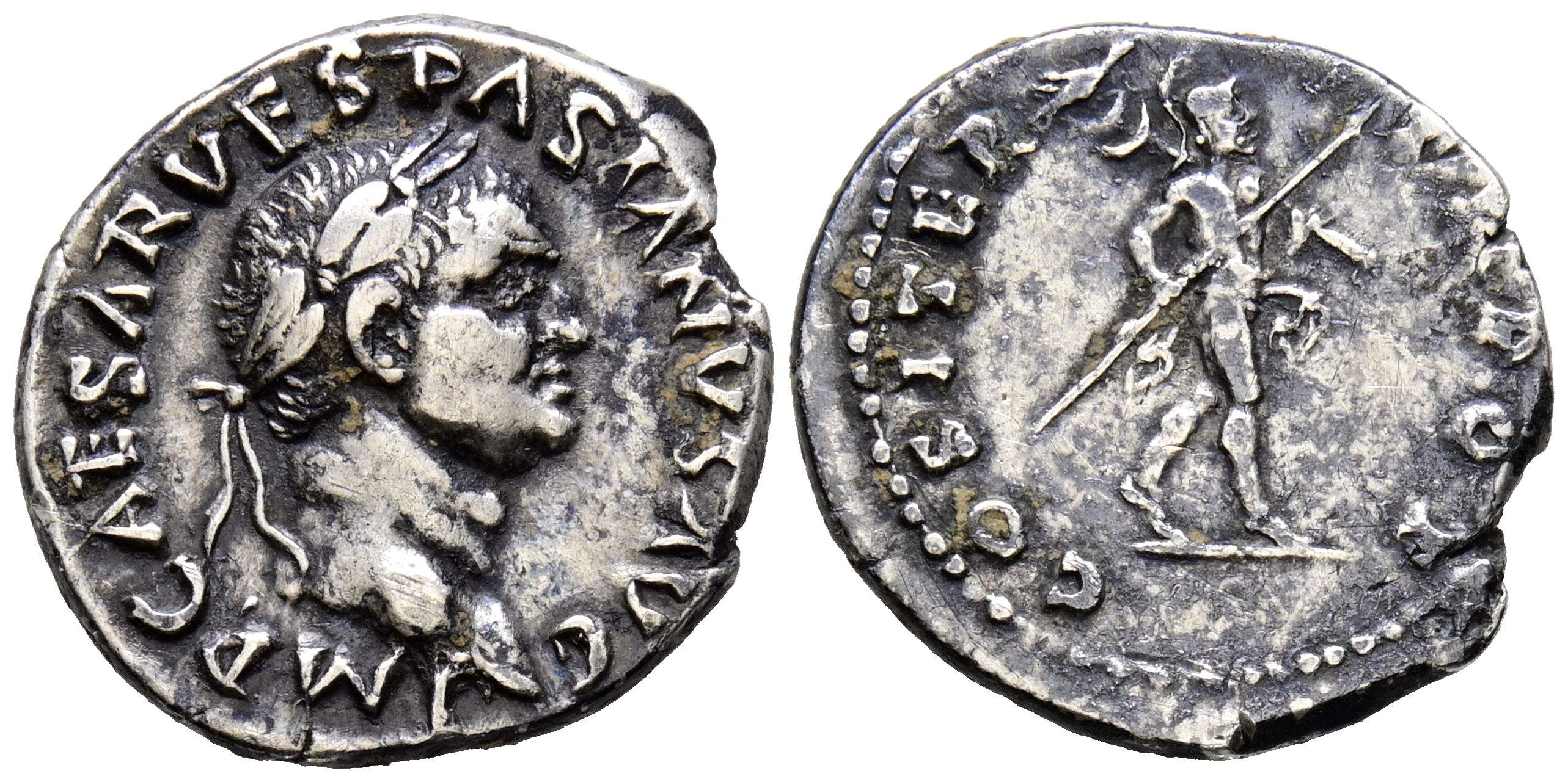 VESPASIANO. Denario. (Ar. 3,33g/19mm). 70 d.C. Roma. (RIC 6). Anv: Cabeza laureada de Vespasiano a derecha, alrededor leyenda: IMP CAESAR VESPASIANVS AVG. Rev: Marte avanzando a derecha portando lanza y águila legionaria, alrededor leyenda: COSITER TR POT. MBC. Escaso ejemplar.