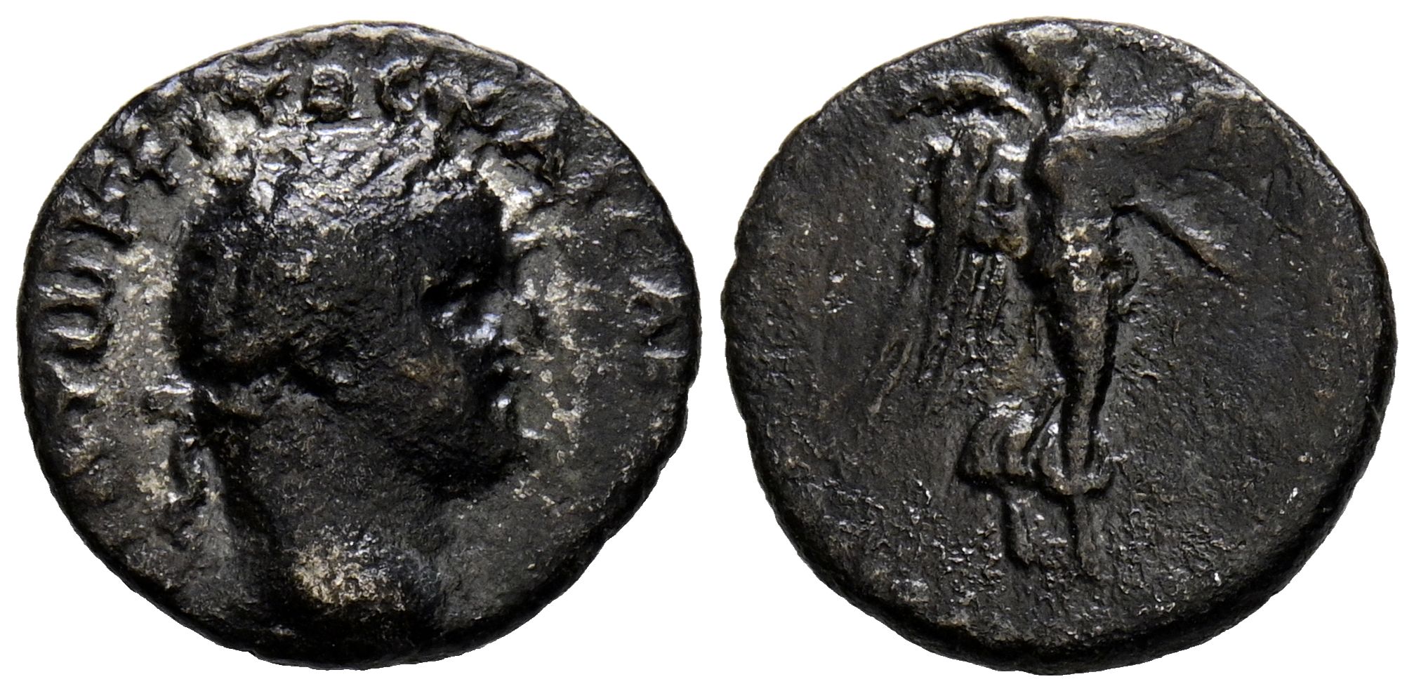 TITO. Hemidracma. (Ar. 1,50g/14mm). 79-81 d.C. Capadocia, Caesarea. (RPC 1661). Anv: Cabeza laureada de Tito a derecha, alrededor leyenda griega. Rev: Victoria avanzando a derecha con corona de laurel. MBC-.