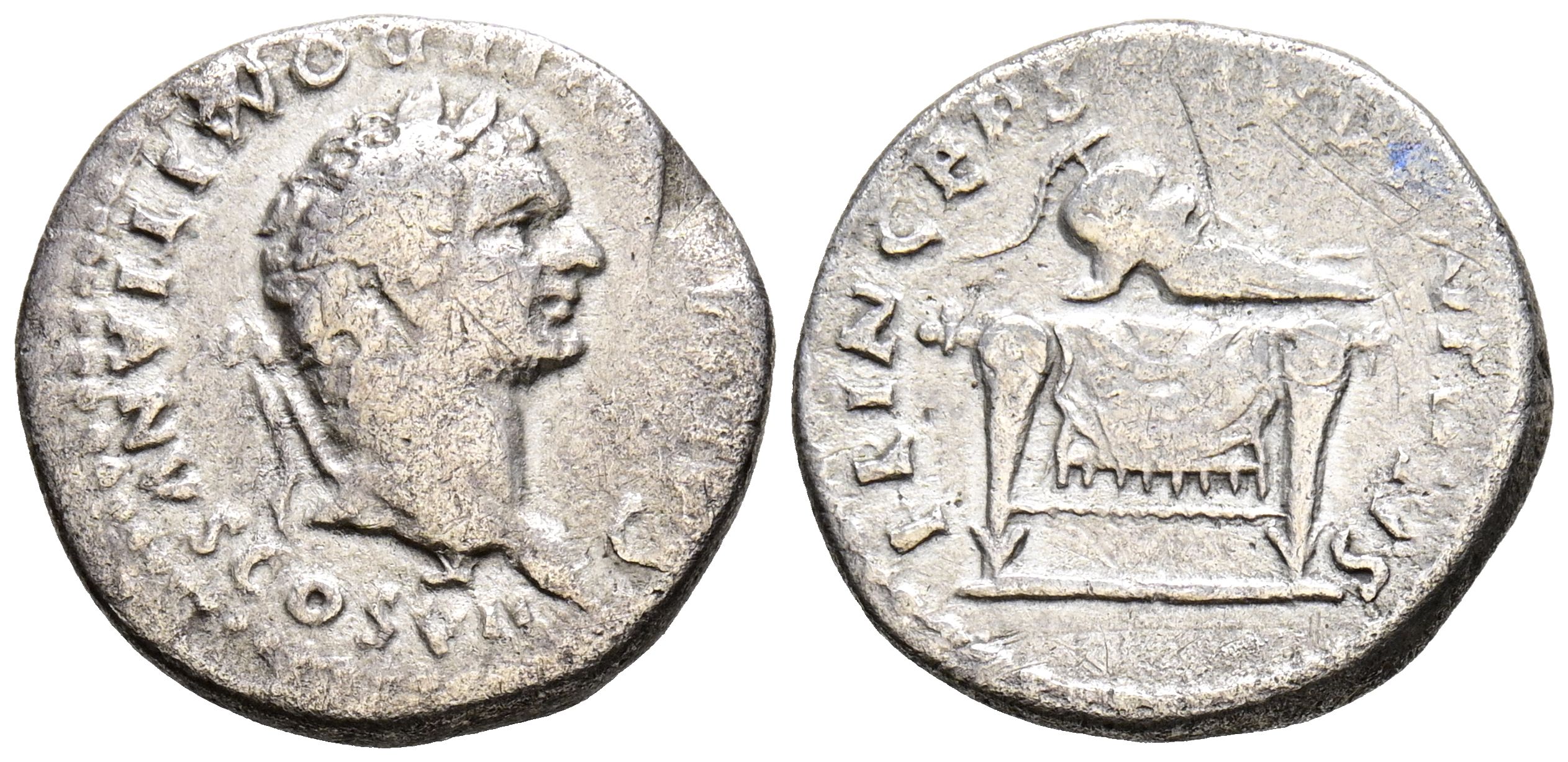 DOMICIANO. Denario. (Ar. 3,08g/17mm). 80 d.C. Roma. (RIC 51). Anv: Cabeza laureada de Domiciano a derecha, alrededor leyenda: CAESAR DIVI F DOMITIANVS COS VII. Rev: Yelmo sobre trono, alrededor leyenda: PRINCEPS IVVENTVTIS. MBC.