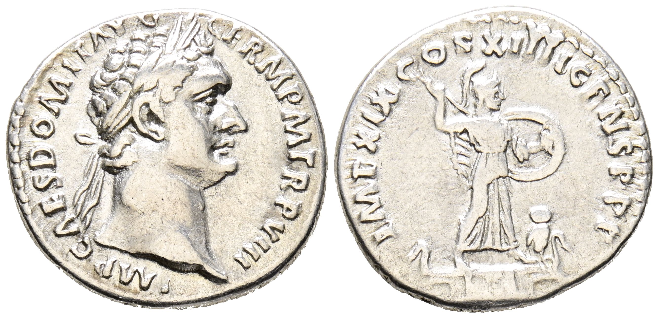 DOMICIANO. Denario. (Ar. 2,98g/20mm). 88-89 d.C. Roma. (RIC 668). Anv: Cabeza laureada de Domiciano a derecha, alrededor leyenda: IMP CAES DOMIT AVG GERM P M TR P VIII. Rev: Minerva estante avanzando a derecha sobre proa portando lanza y escudo, a sus pies búho, alrededor leyenda: IMP XIX COS XIIII CENS P P. MBC+/MBC.