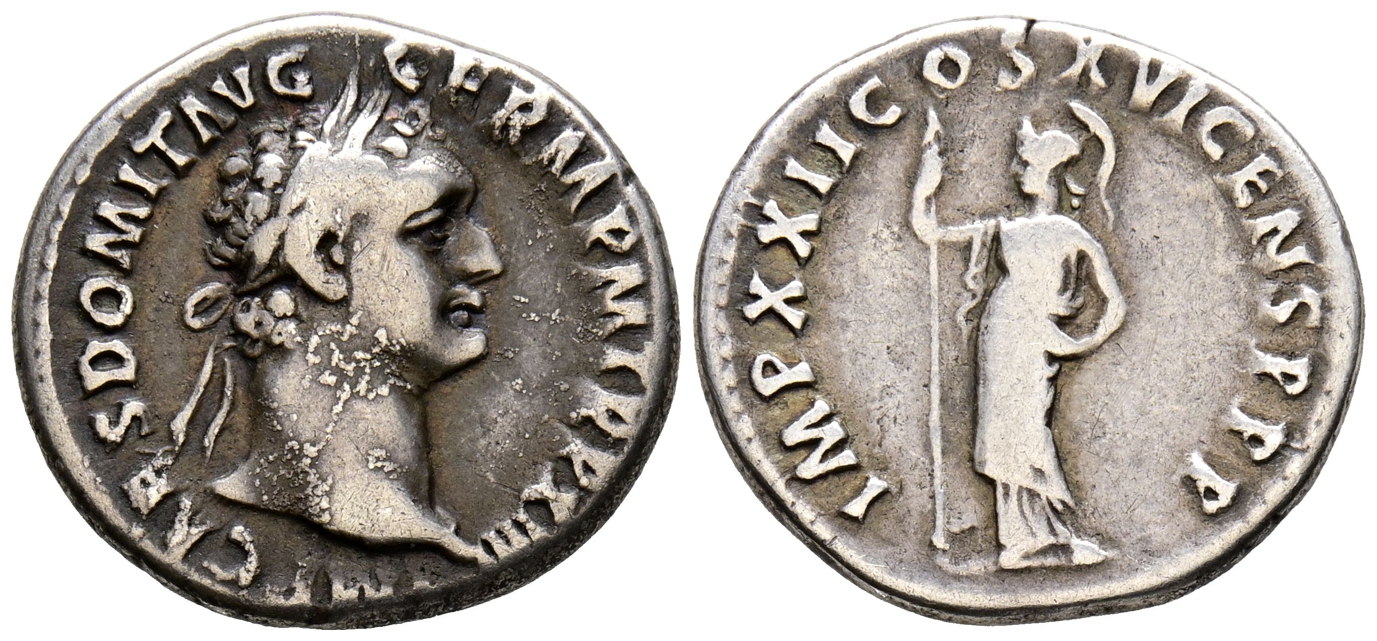 DOMICIANO. Denario. (Ar. 3,18g/19mm). 95 d.C. Roma. (RIC 773). Anv: Cabeza laureada de Domiciano a derecha, alrededor leyenda: IMP CAES DOMIT AVG GERM P M TR P XIIII. Rev: Minerva estante a izquierda portando lanza y escudo, alrededor leyenda: IMP XII COS XVI CENS P P P. MBC.