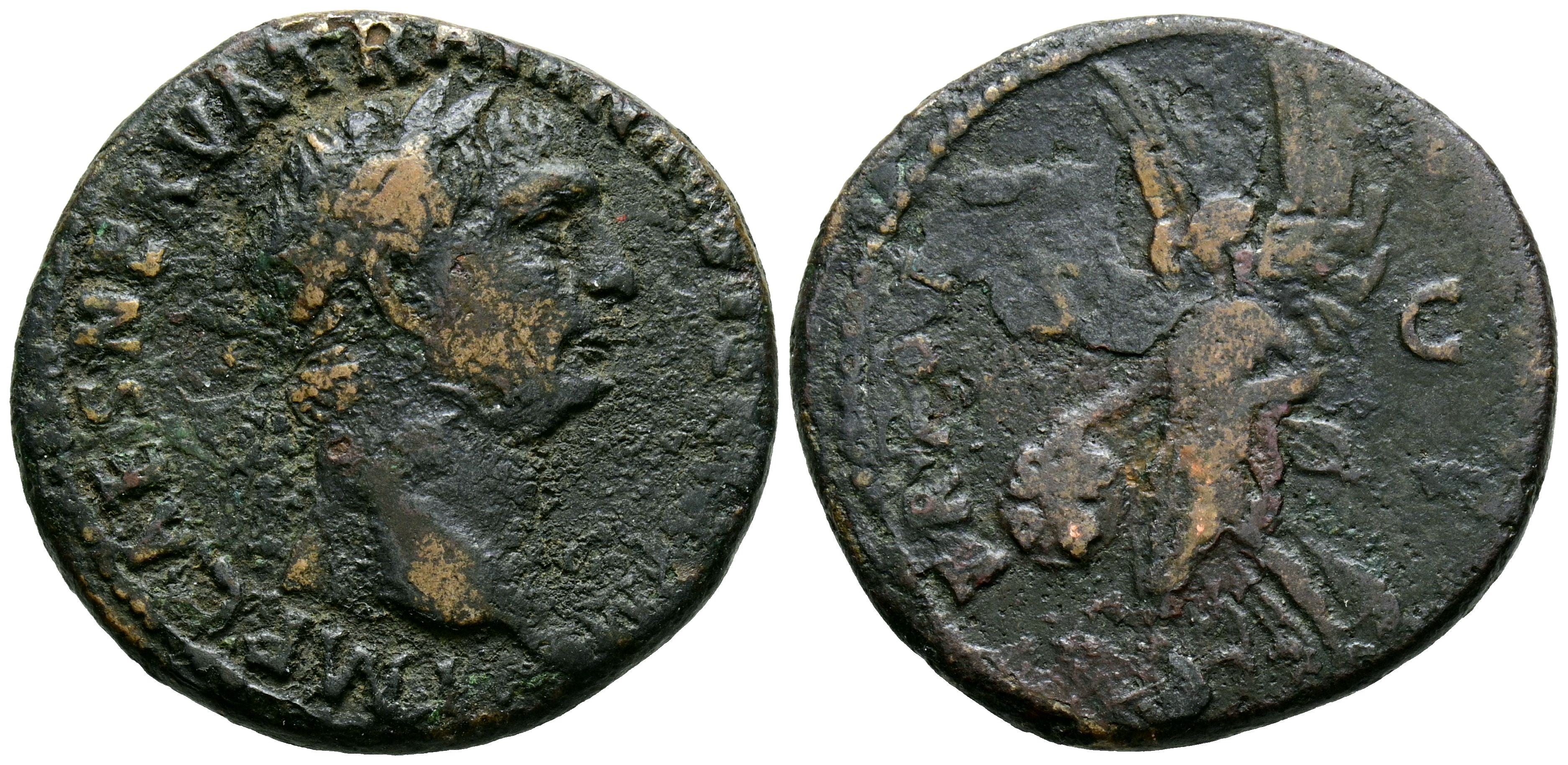 TRAJANO. As. (Ae. 9,50g/26mm). 98 d.C. Roma. (RIC 402). Anv: Cabeza laureada de Trajano a derecha, alrededor leyenda: IMP CAES NERVA TRAIAN AVG GERM. Rev: Victoria avanzando a izquierda portando escudo con inscripción: SP/QR, entre: S-C, alrededor leyenda: TR POT COS II P P. MBC/MBC-.