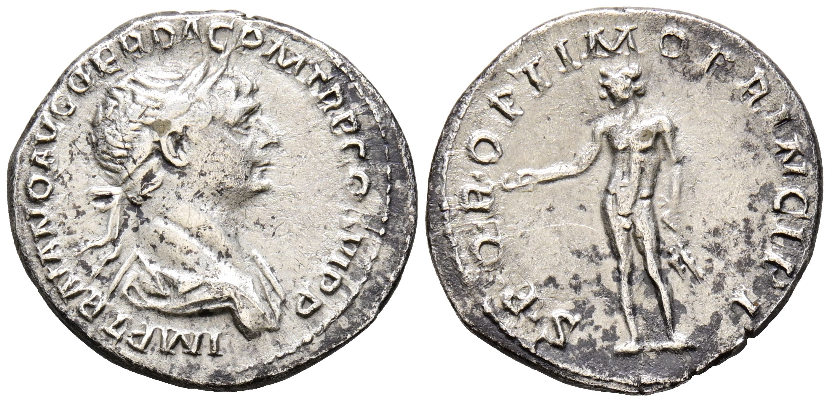 TRAJANO. Denario. (Ar. 3,13g/21mm). 112-114 d.C. Roma. (RIC 276var). Anv: Busto laureado y drapeado de Trajano a derecha, alrededor leyenda: IMP TRAIANO AVG GER DAC P M TR P COS VI P P. Rev: Genio estante a izquierda portando patera y espigas, alrededor leyenda: SPQR OPTIMO PRINCIPI. MBC.