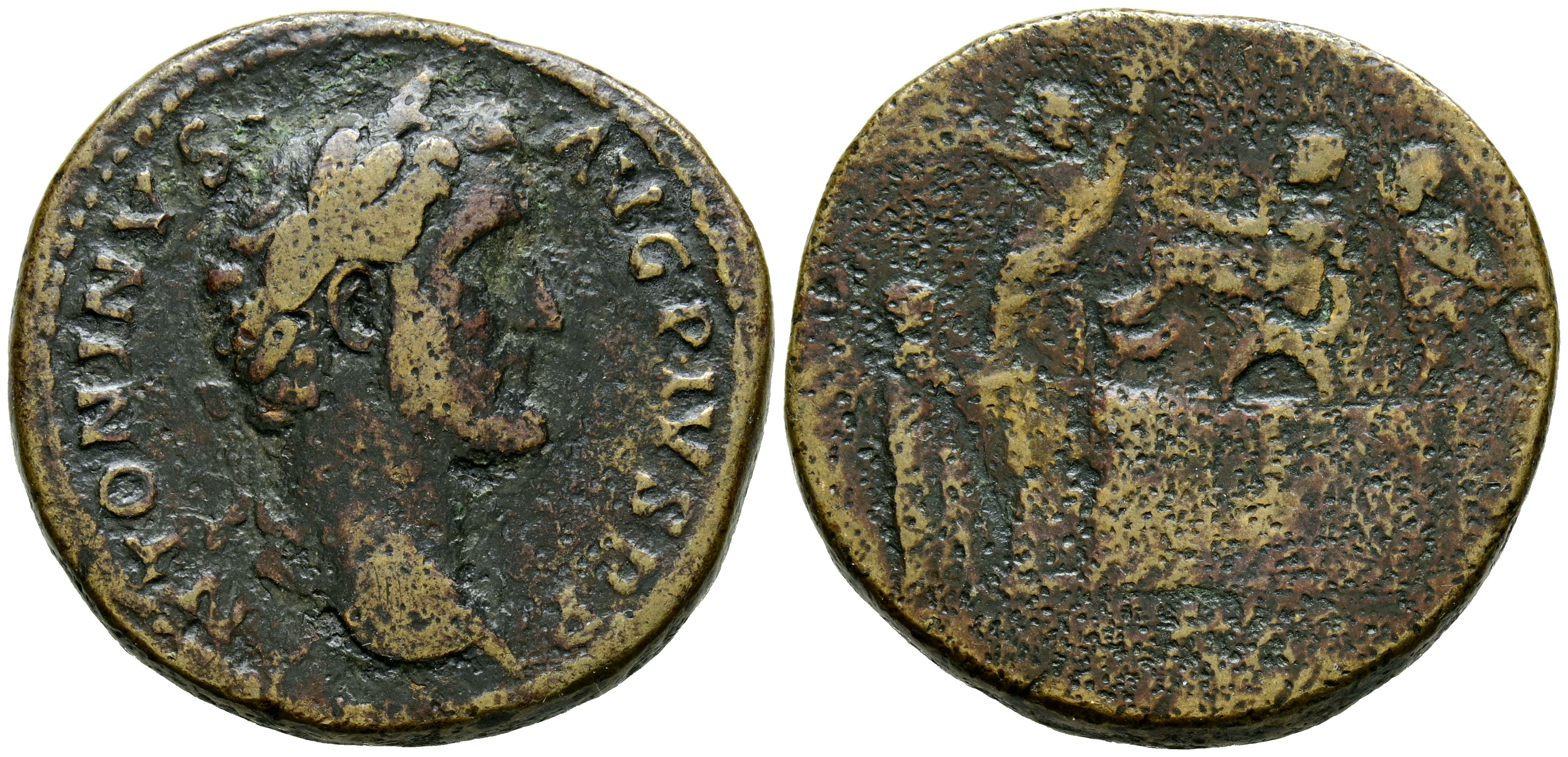 ANTONINO PIO. Sestercio. (Ae. 21,22g/32mm). 145-161 d.C. Roma. (RIC 774). Anv: Cabeza laureada de Antonino Pío a derecha, alrededor leyenda: ANTONINVS AVG PIVS P P TR P. Rev: Antonino Pío sentado en un estrado a izquierda, flanqueado por un funcionario y Liberalitas, ante él ciudadano, en exergo: LIBERALITAS/AVG IIII, encima: COS IIII. BC+. Limpiado.