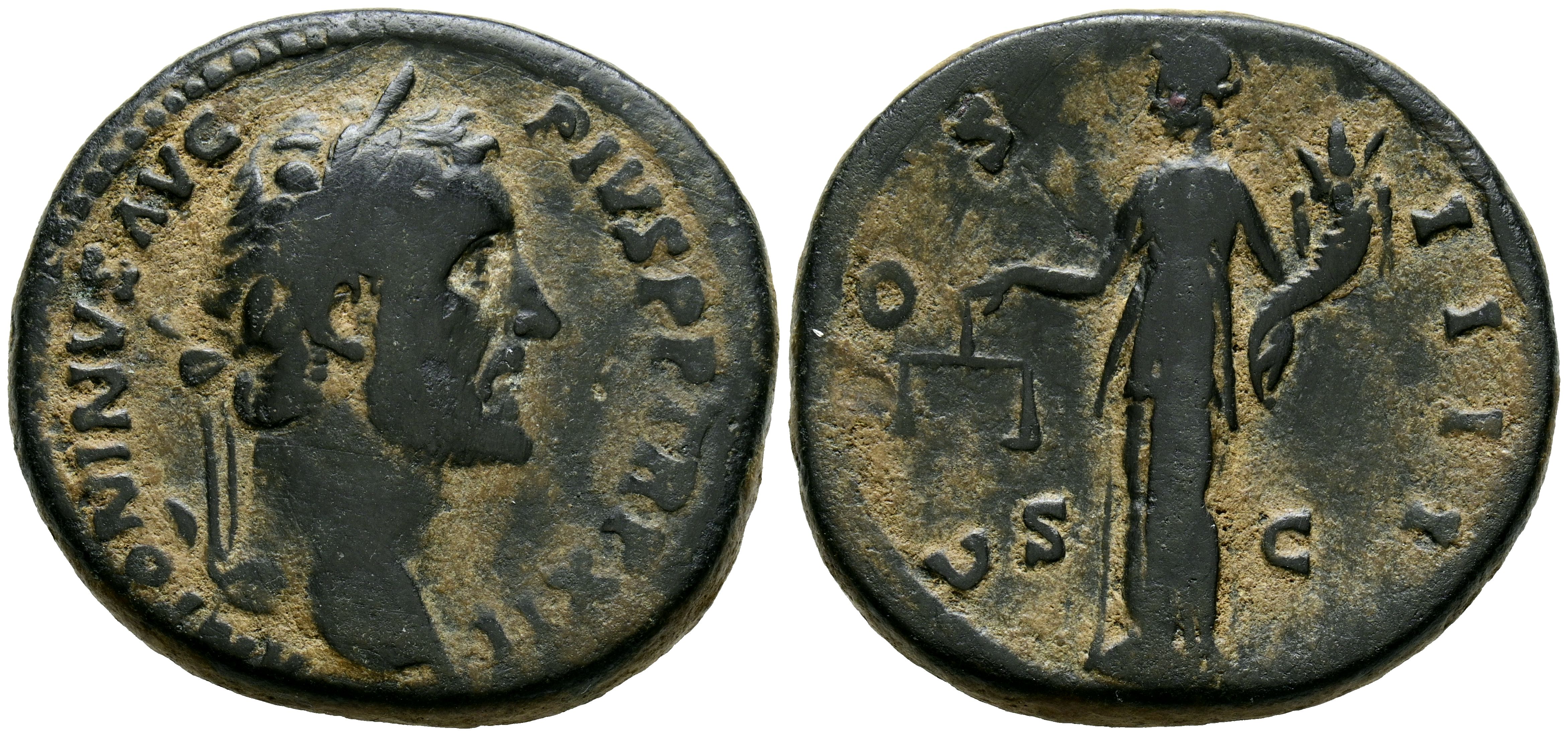ANTONINO PIO. Sestercio. (Ae. 24,48g/32mm). 150-151 d.C. Roma. (RIC 886). Anv: Cabeza laureada de Antonino Pío a derecha, alrededor leyenda: ANTONINVS AVG PIVS P P TR P. Rev: Aequitas estante a izquierda portando escalas y cornucopia, entre: S-C, alrededor leyenda: COS IIII. MBC-.