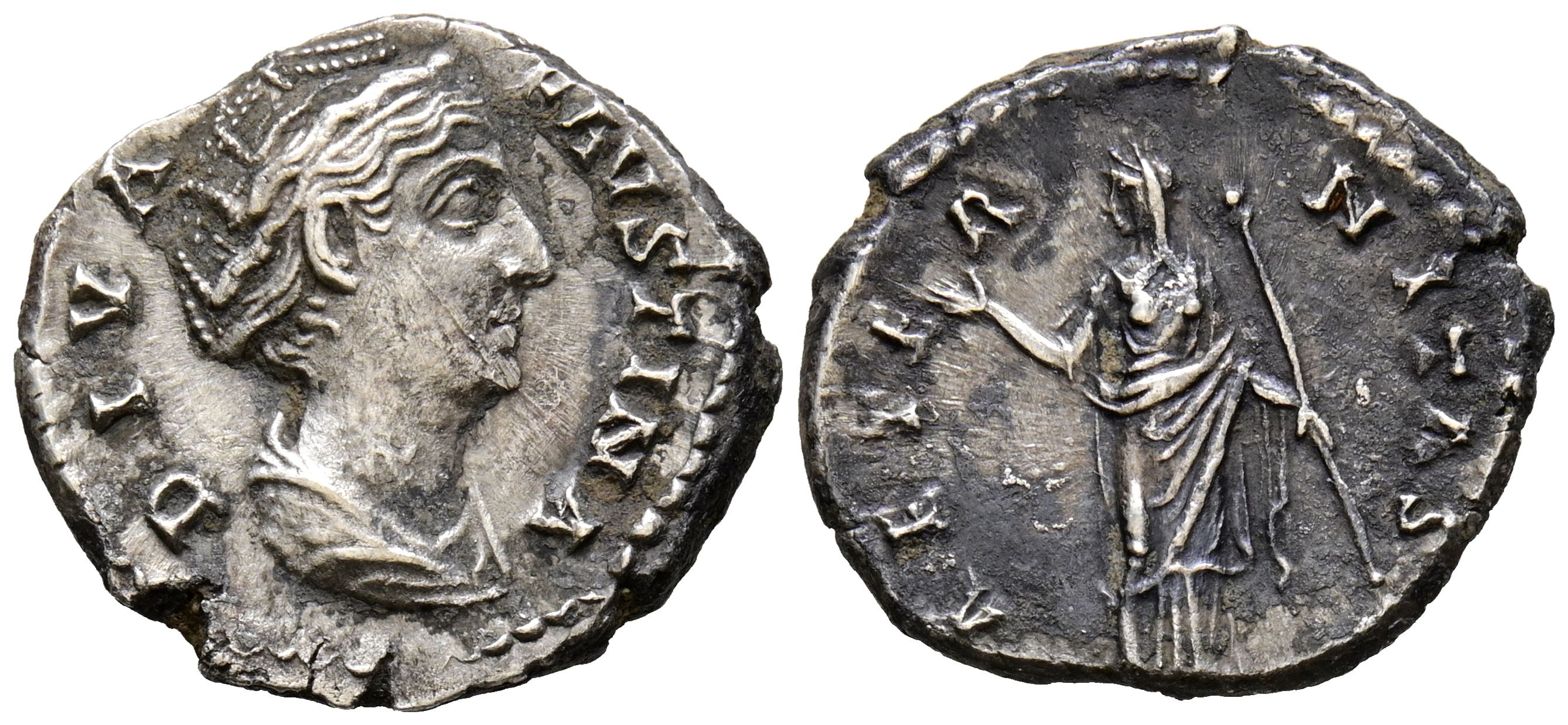 FAUSTINA I. Denario. (Ar. 3,22g/19mm). 140-141 d.C. Roma. (RIC 344). Anv: Busto diademado y drapeado de Faustina I a derecha, alrededor leyenda: DIVA FAVSTINA. Rev: Aeternitas estante a izquierda portando globo y cetro, alrededor leyenda: AETERNITAS. MBC-.