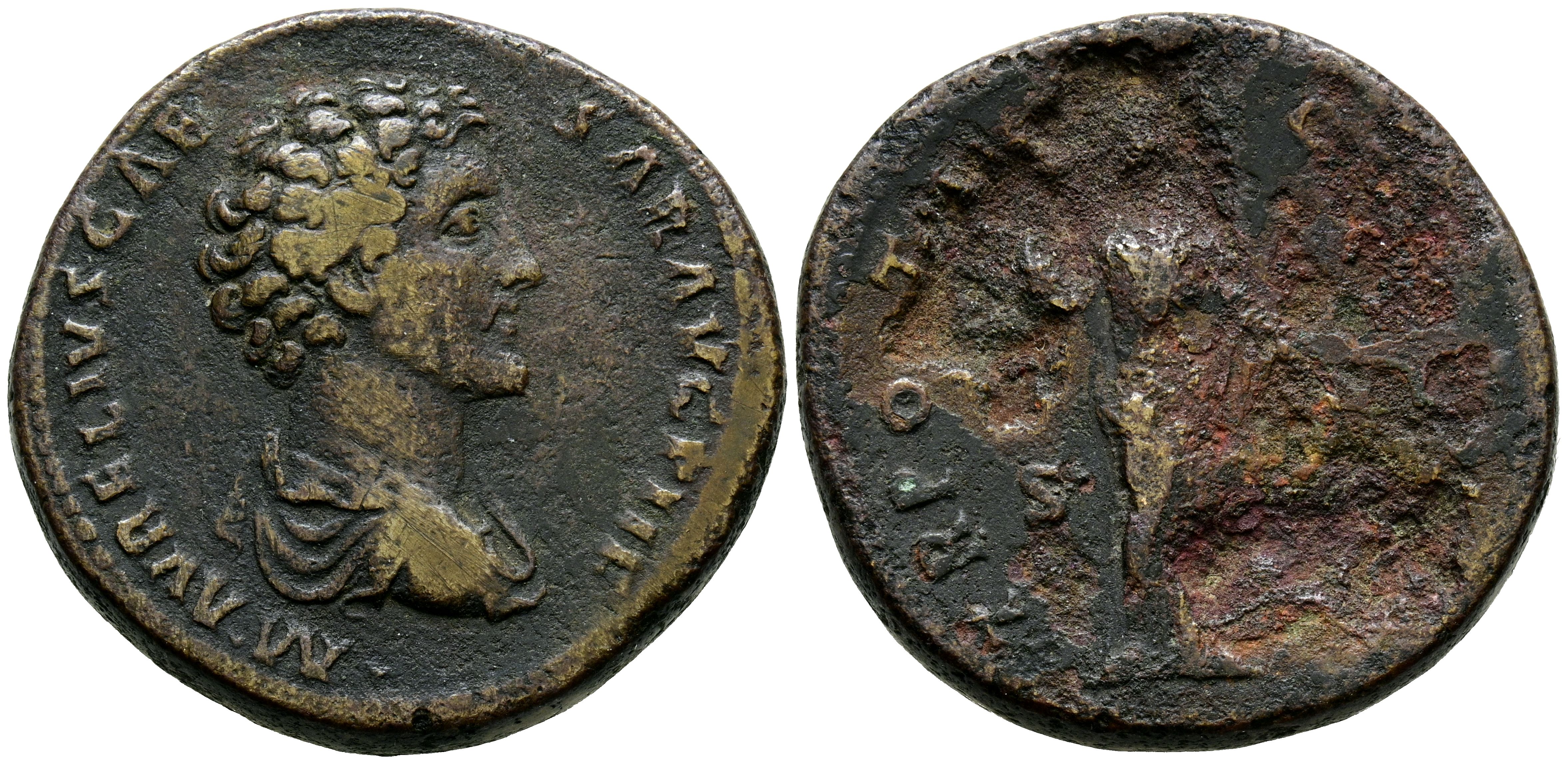 MARCO AURELIO. Sestercio. (Ae. 25,97g/33mm). 147 d.C. Roma. (RIC 1248). Anv: Cabeza de Marco Aurelio a derecha, alrededor leyenda: M AVRELIVS CAESAR AVG PII F. Rev: Minerva estante a derecha portando lanza y escudo, entre: S-C, alrededor leyenda: TR POT COS II P P. MBC-. Limpiado.