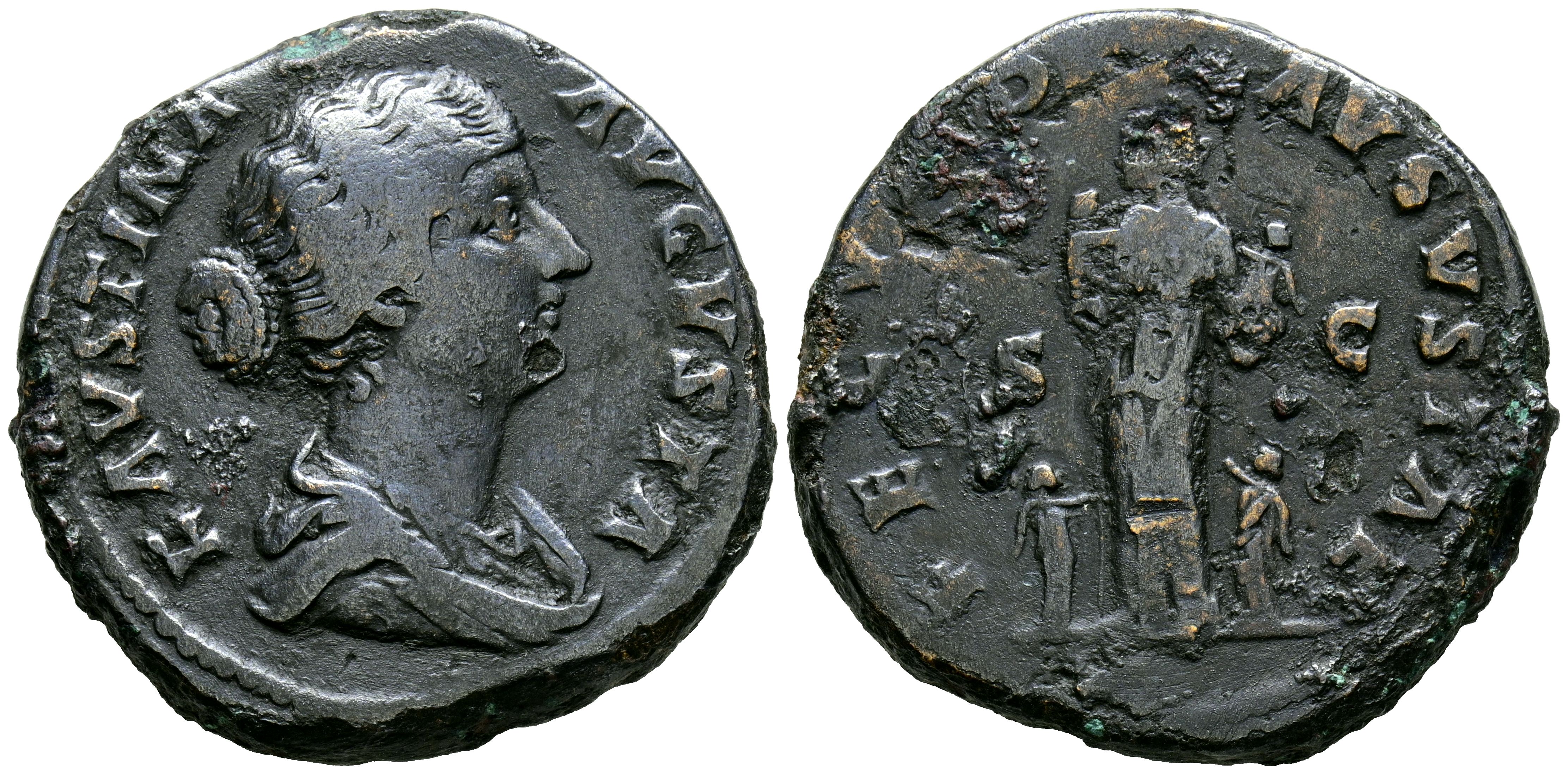 FAUSTINA II. Sestercio. (Ae. 19,98g/31mm). 161-176 d.C. Roma. (RIC 1635). Anv: Busto drapeado de Faustina II a derecha, alrededor leyenda: FAVSTINA AVGVSTA. Rev: Fecunditas estante a izquierda sosteneindo dos infantes y dos niños a sus pies, entre: S-C, alrededor leyenda: FECVND AVGVSTAE. MBC. Limpiada. Oxidaciones.
