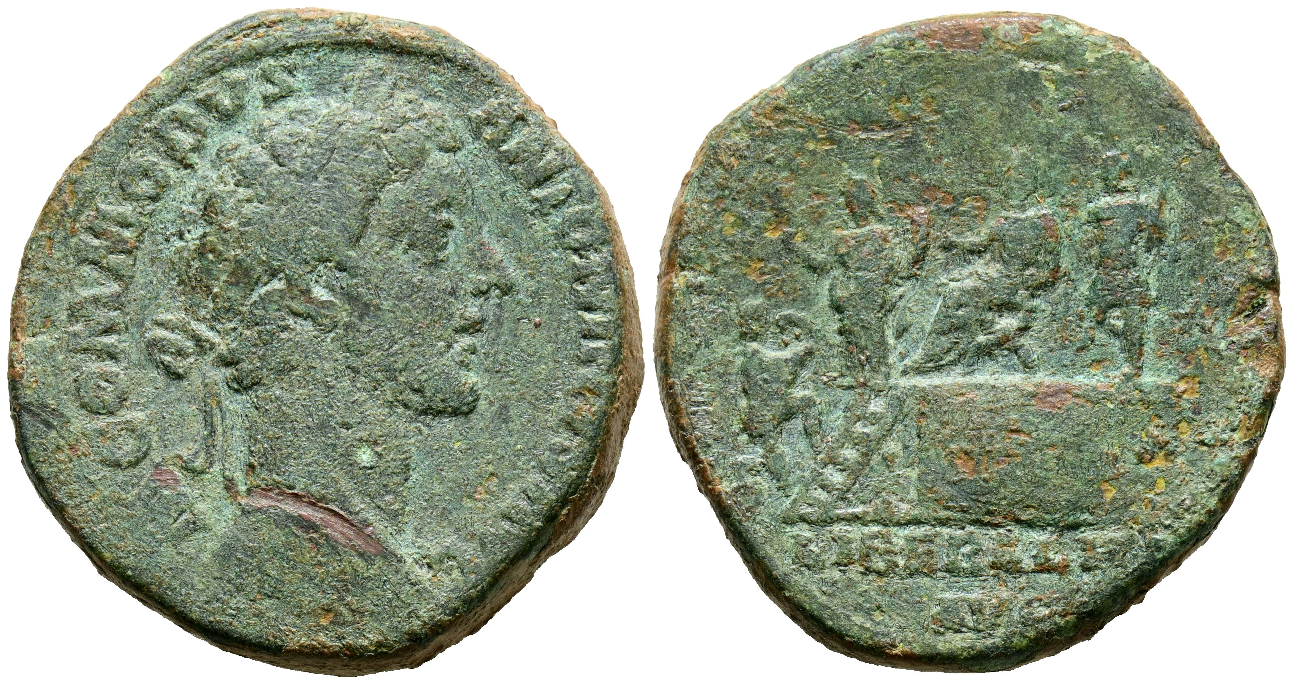 COMODO. Sestercio. (Ae. 23,30g/31mm). 180 d.C. Roma. (RIC 300). Anv: Busto drapeado y laureado de Cómodo a derecha, alrededor leyenda: M COMMODVS ANTONINVS AVG. Rev: Cómodo sentado en estrado con Liberalitas y prefecto entregando dádivas a personaje en las escaleras, en campo S-C. en exergo: LIBERALITAS/AVG, alrededor leyenda: TR P V IMP IIII COS II P P. MBC-. Escasa.